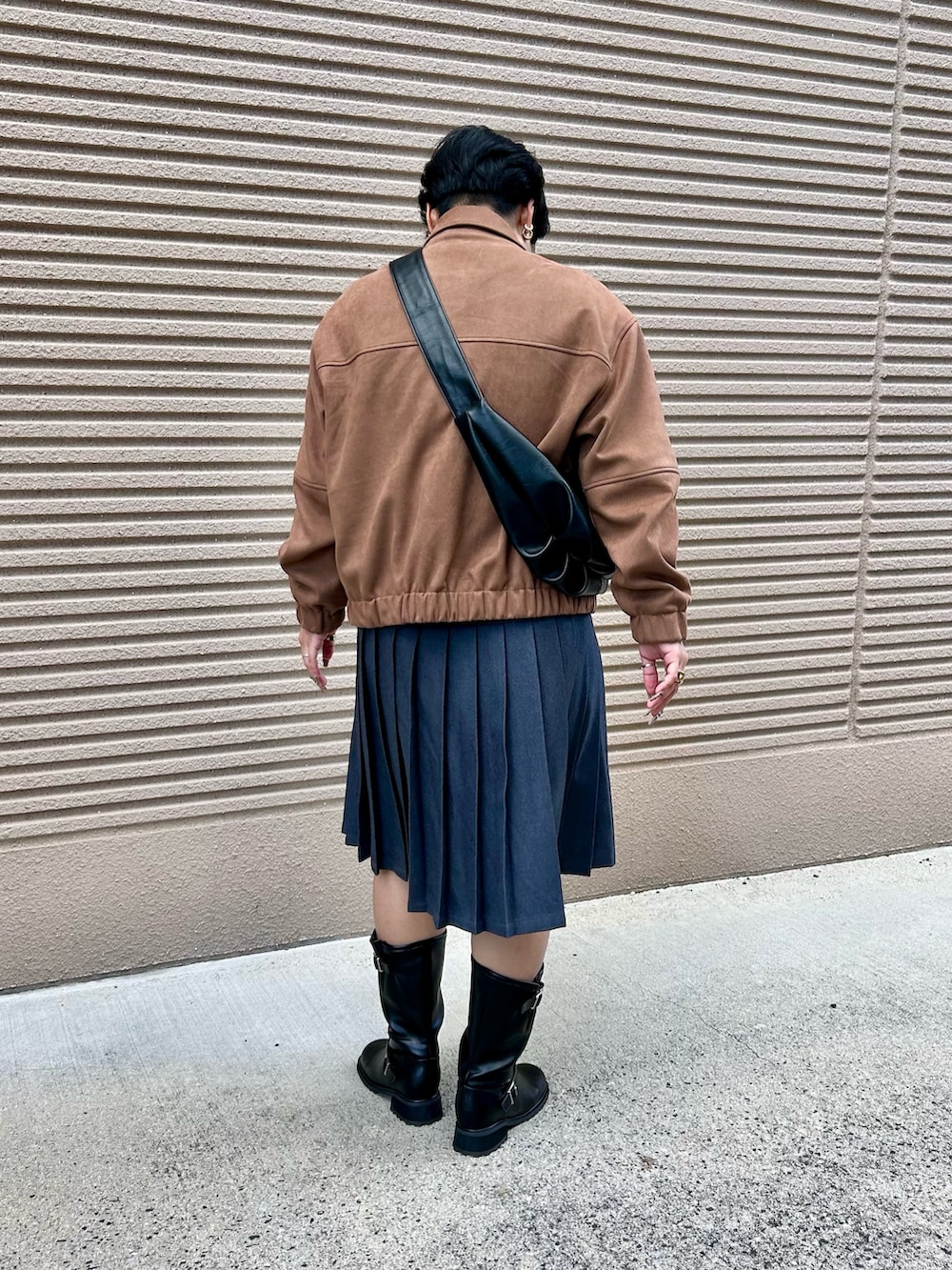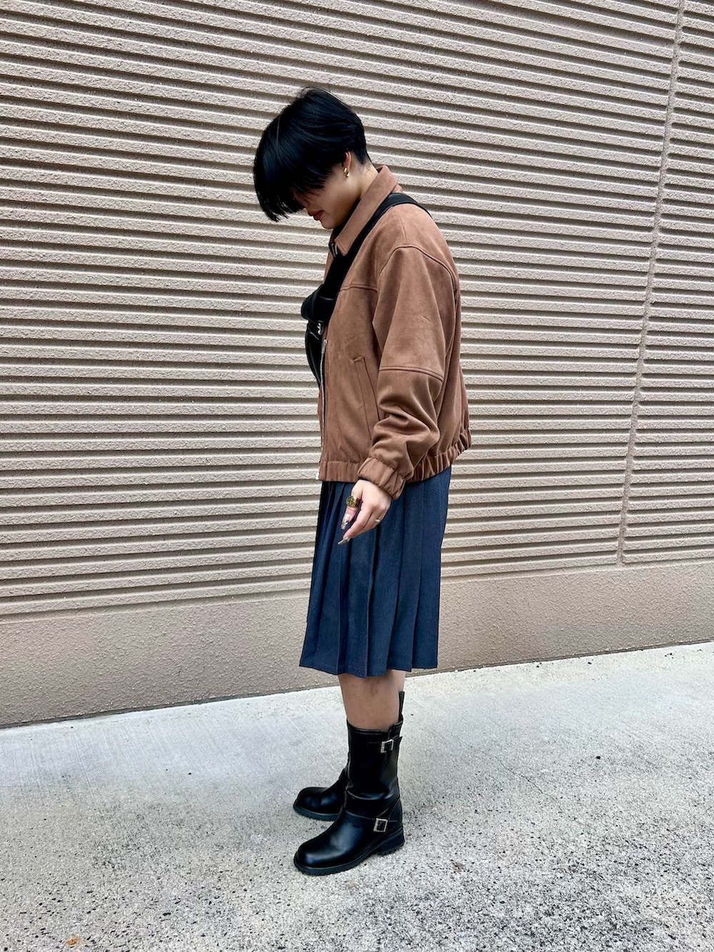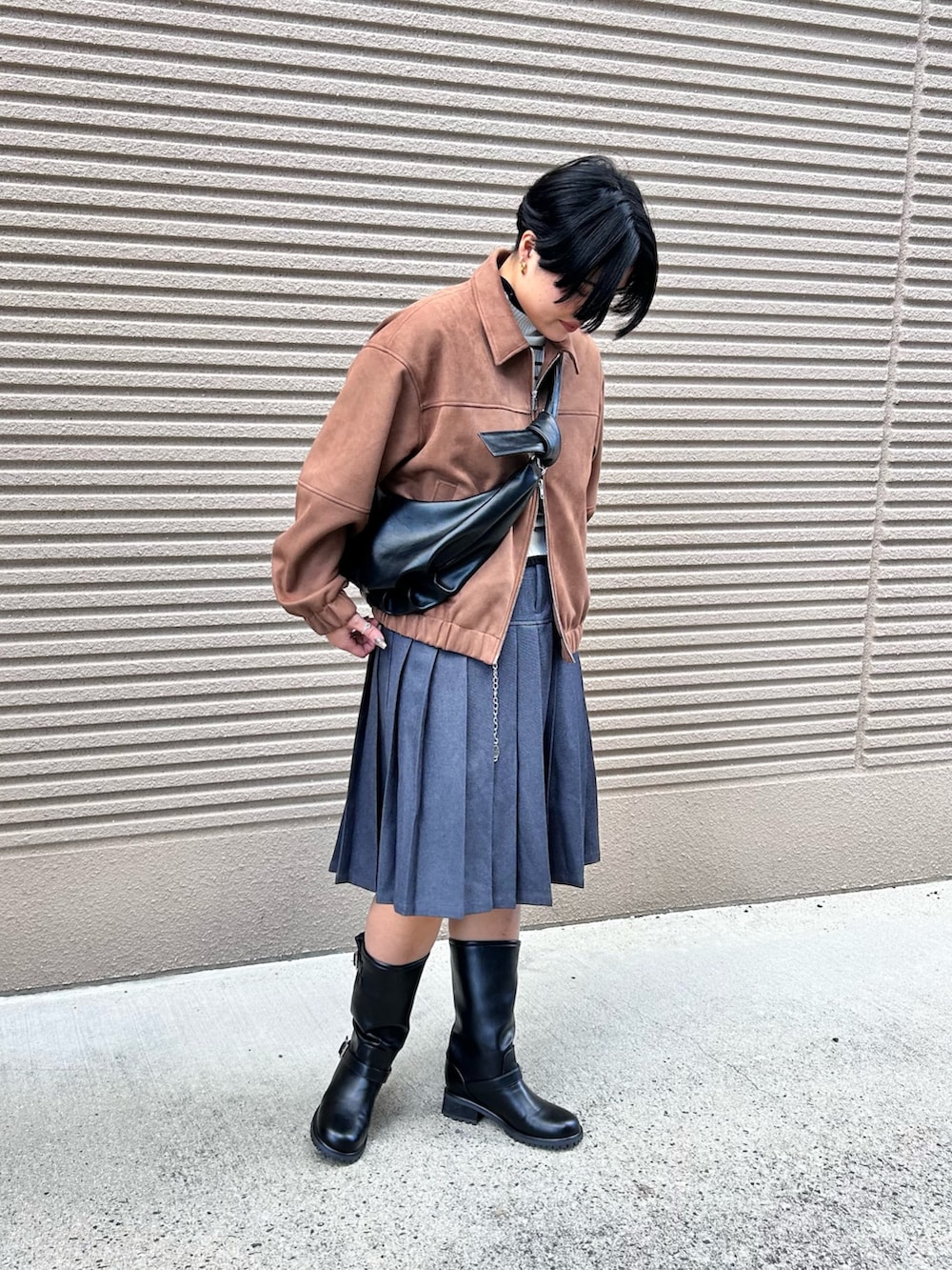 ミディアム丈のスカートとブーツで少し肌見せすることで、着痩せ大成功間違いなし◎