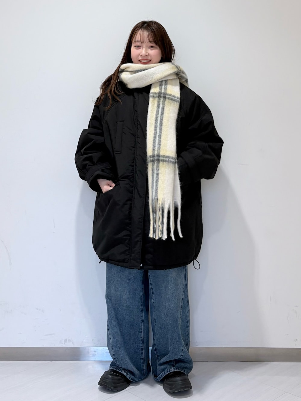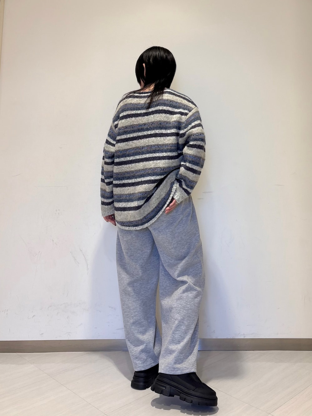 キラキララメがかわいいニットを、スウェットパンツと合わせてゆるりとした楽ちんコーデにしました。