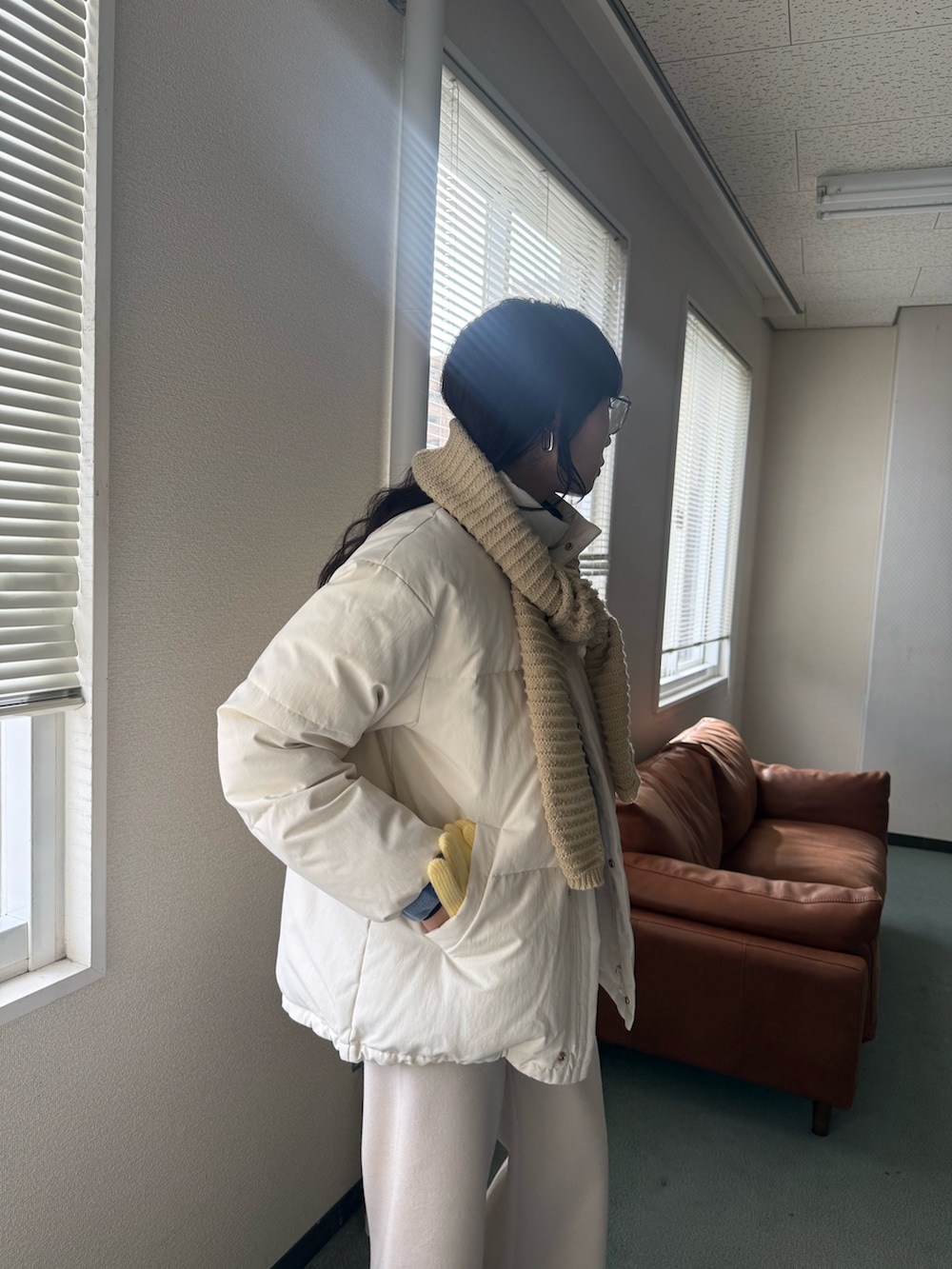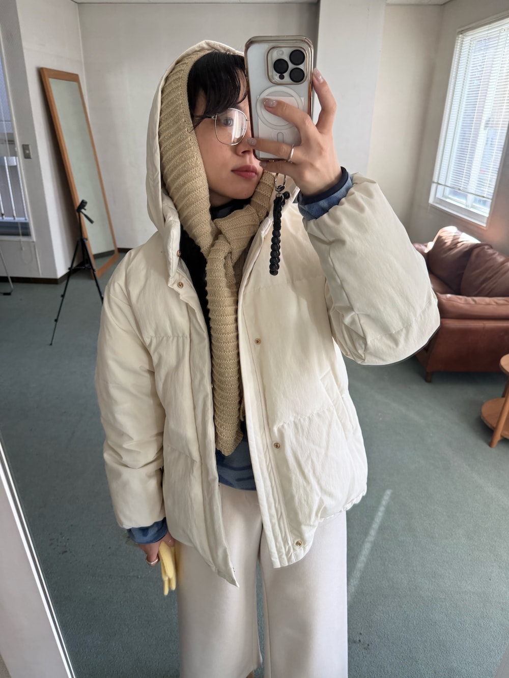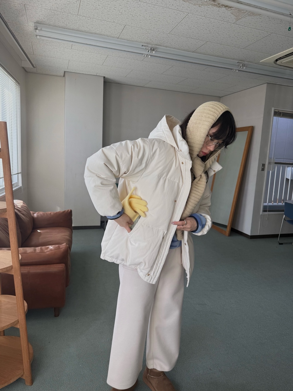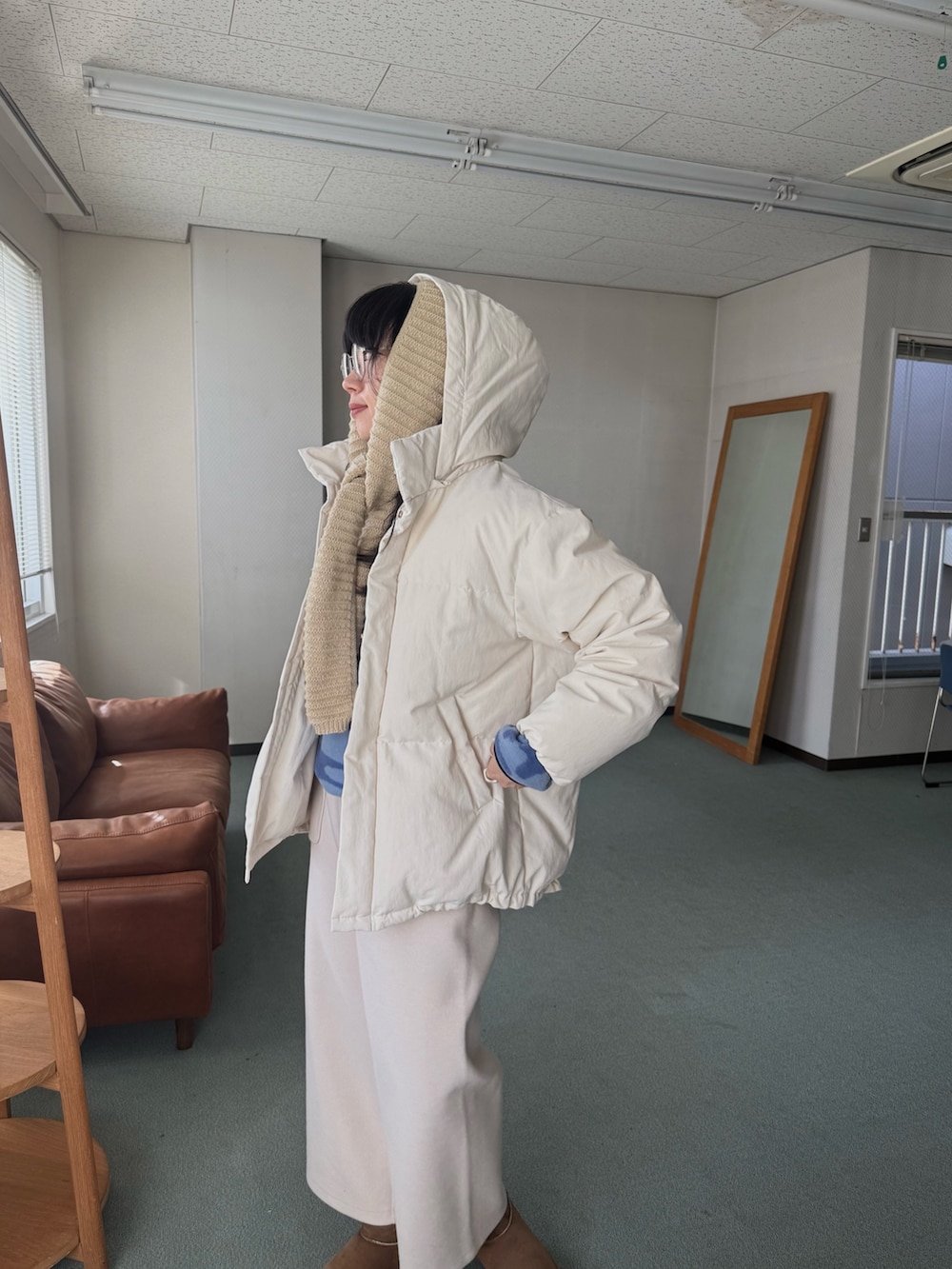 フードは外せるので気分やスタイリングのバランスで調整可能。マフラーとのダブル使いも今年らしくボリュームが出てかわいいですよ。