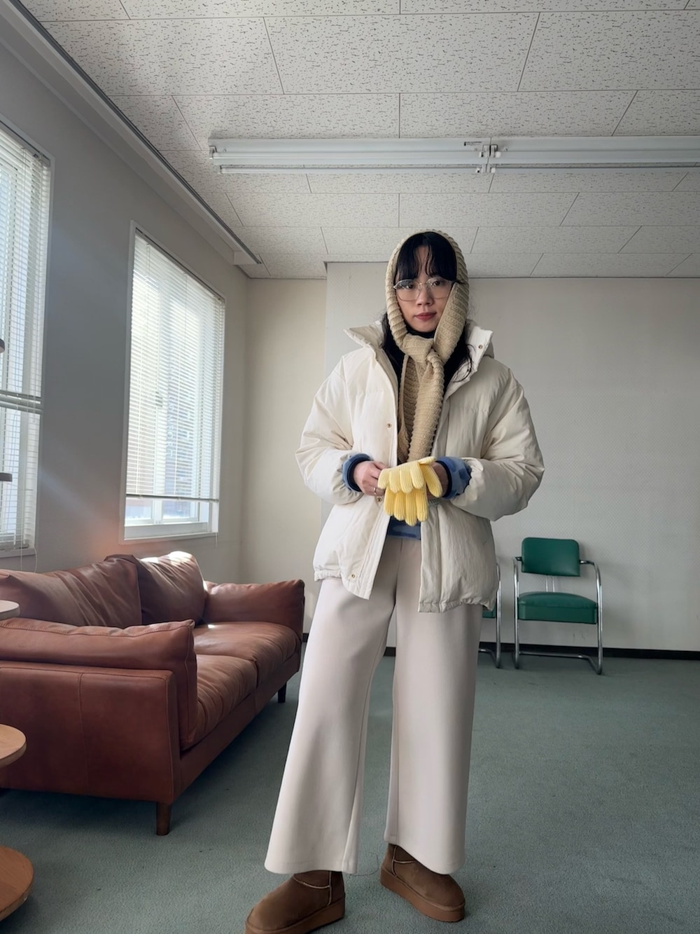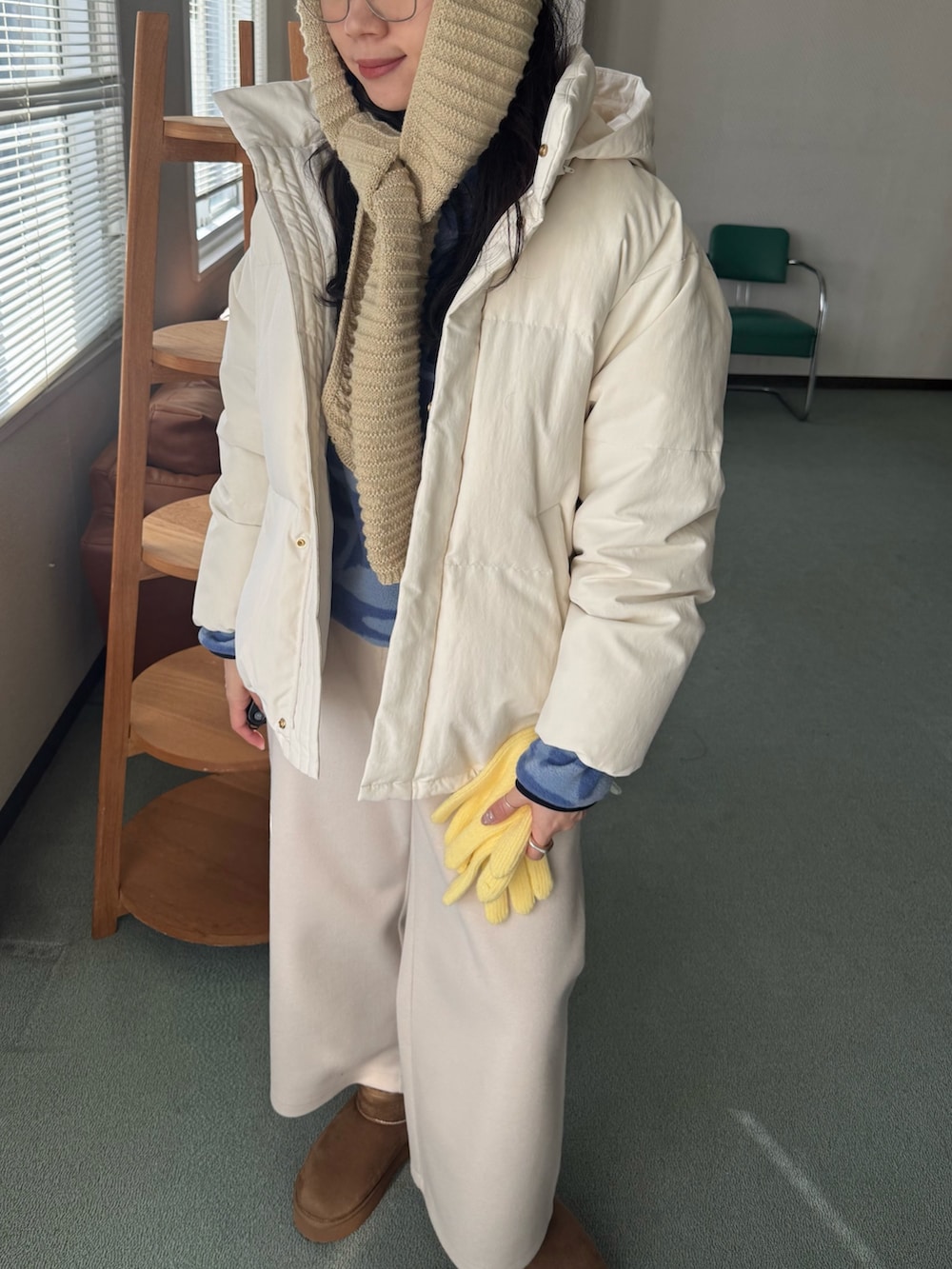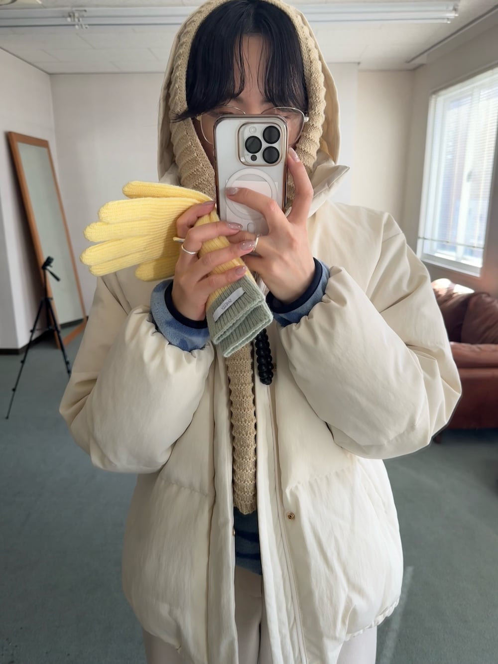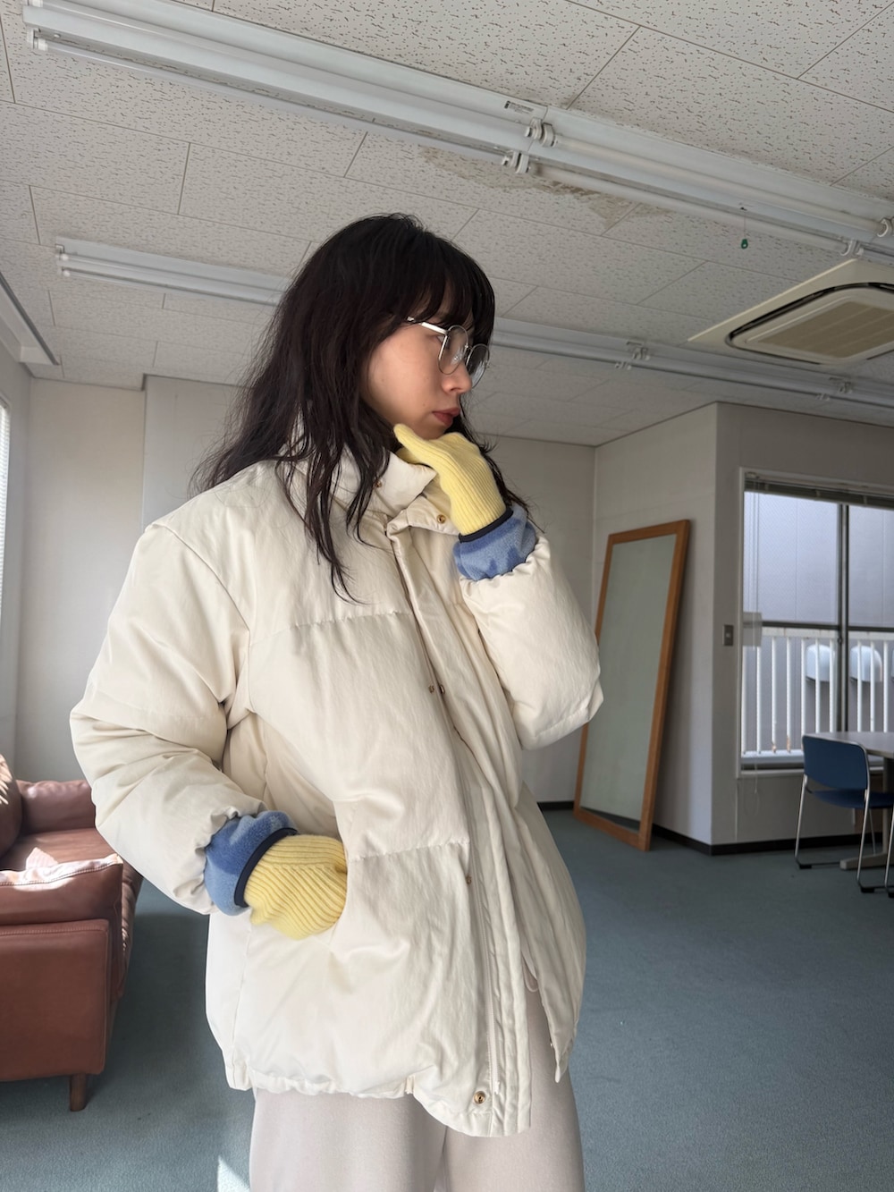 フードは外せるので気分やスタイリングのバランスで調整可能。マフラーとのダブル使いも今年らしくボリュームが出てかわいいですよ。