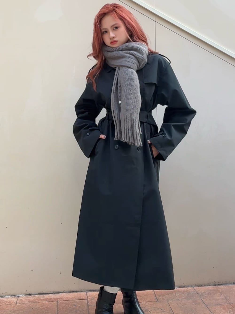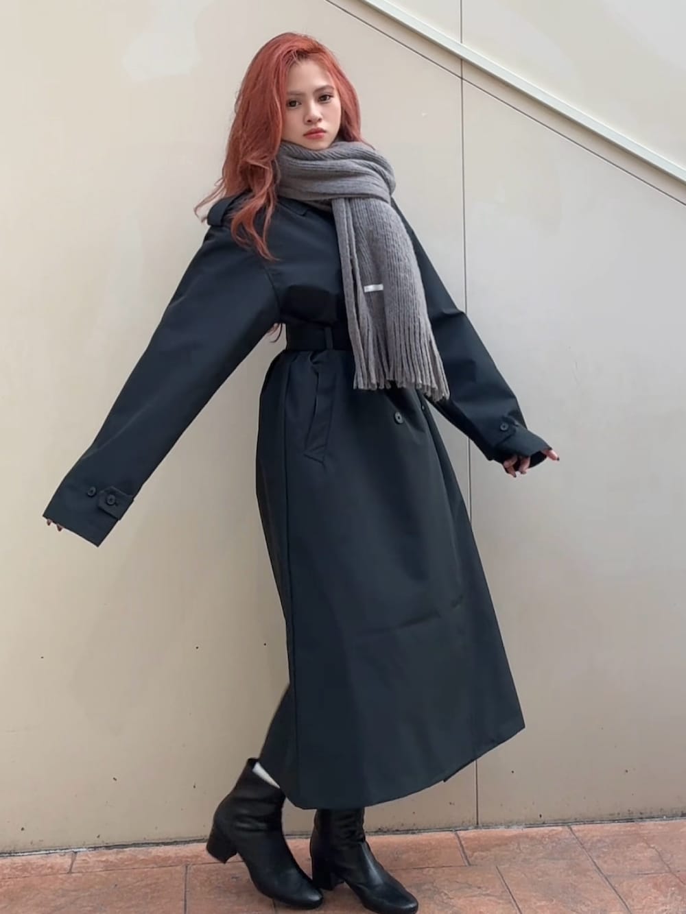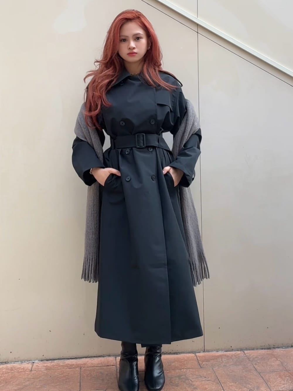 撥水・防風機能を備えた3レイヤーのトレンチコートを主役に、共布ベルトでウエストマークして女性らしいシルエットに。足元はブーツで季節感と安定感をプラスし、全体を引き締めるバランスに仕上げました。マフラーを添えることで防寒性と奥行きを演出し、寒風や小雨の日でも上品に映える、実用性と洗練を両立したコーデです。