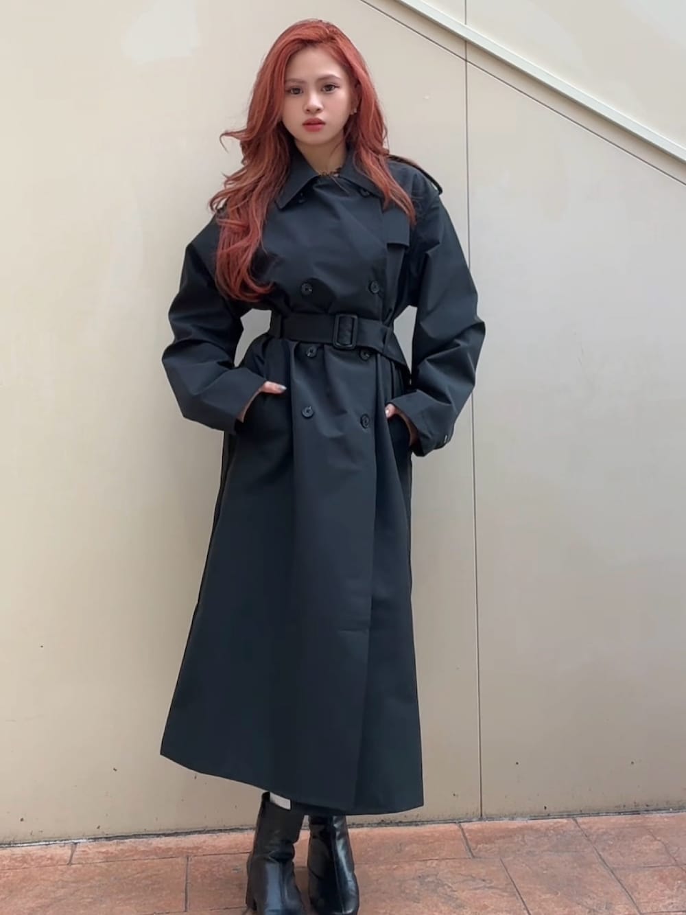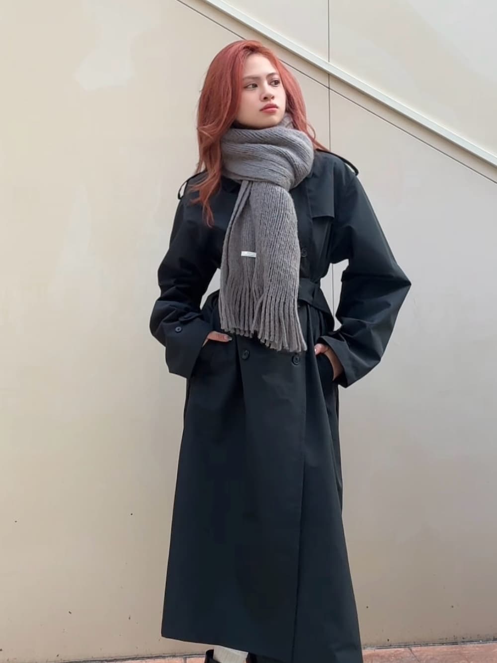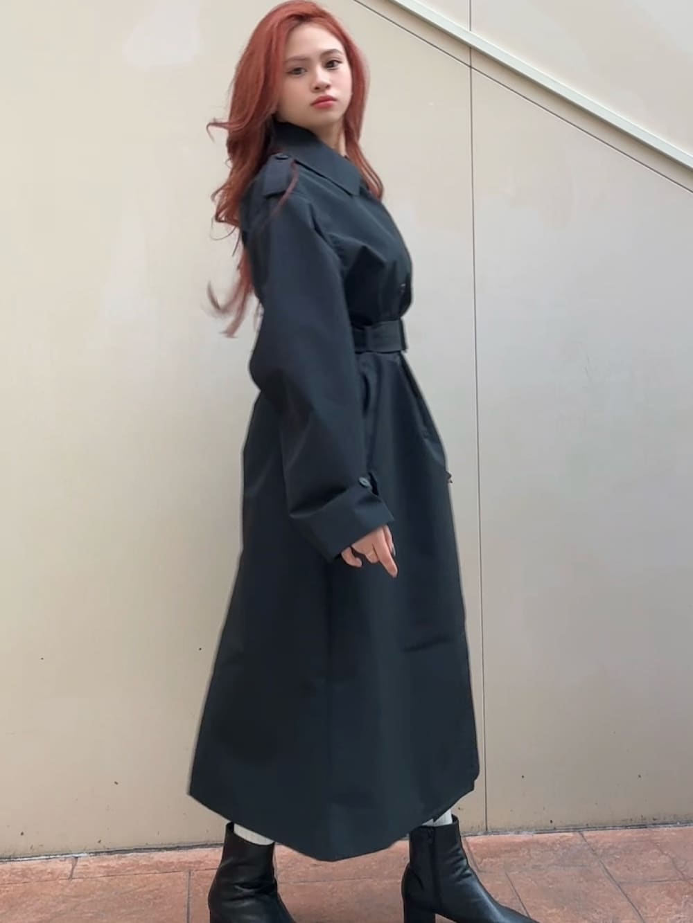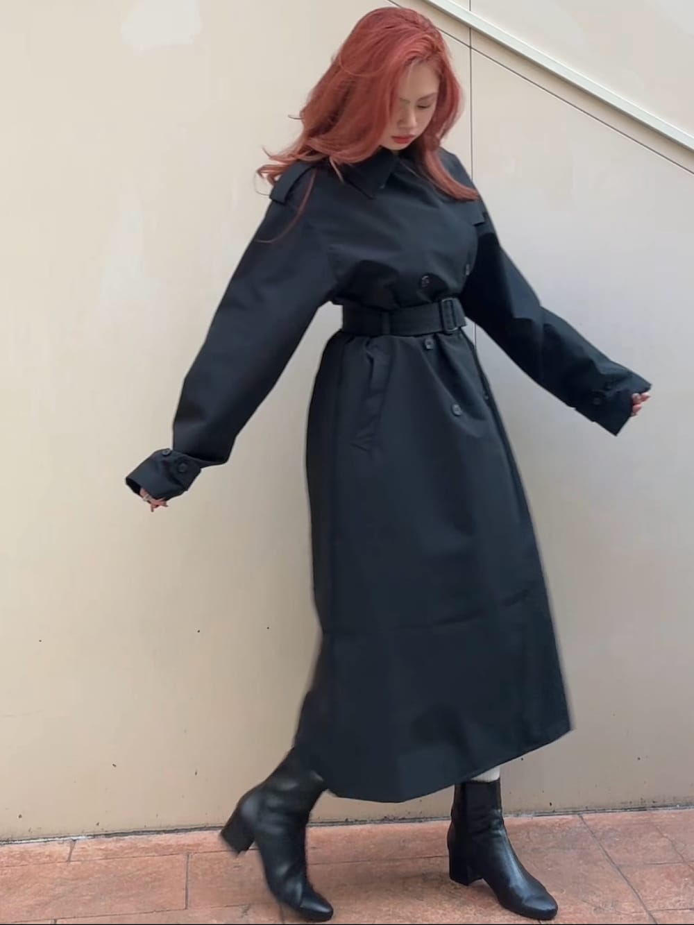 撥水・防風機能を備えた3レイヤーのトレンチコートを主役に、共布ベルトでウエストマークして女性らしいシルエットに。足元はブーツで季節感と安定感をプラスし、全体を引き締めるバランスに仕上げました。マフラーを添えることで防寒性と奥行きを演出し、寒風や小雨の日でも上品に映える、実用性と洗練を両立したコーデです。