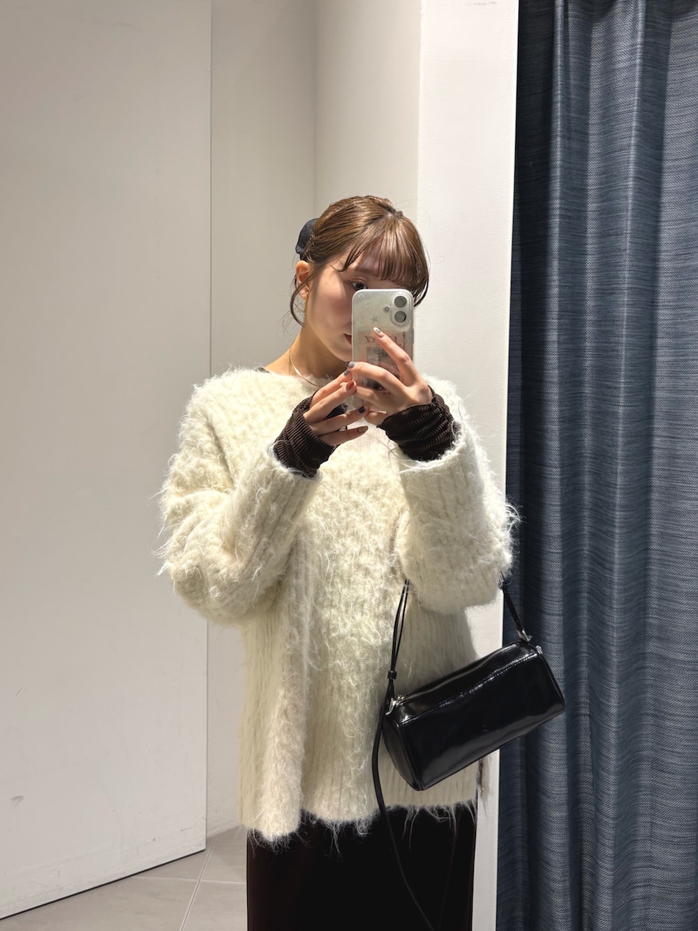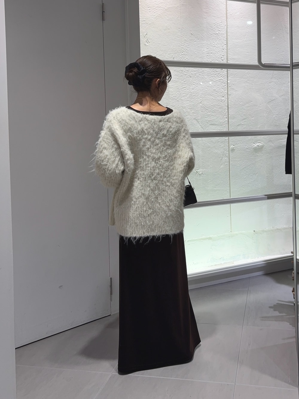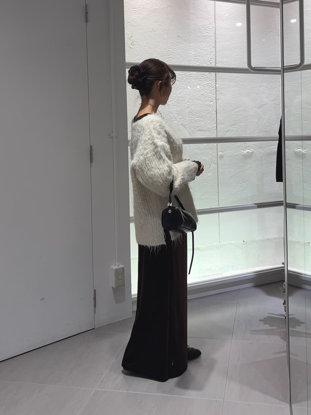 ゆったりしたシルエットのニットの中にベロアのカットソーをレイヤードして袖から出す合わせが可愛いです♡