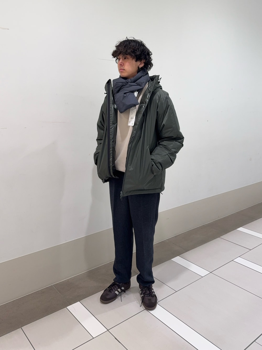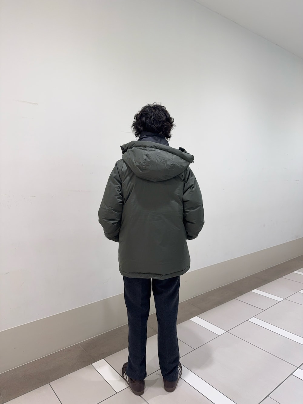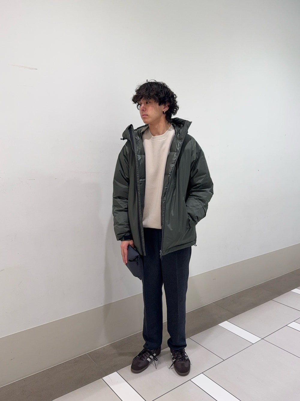 いつもご覧いただきありがとうございます。このコーデは全体をオリーブとグレー、ブラックのダークトーンで統一しつつ、ダウンジャケットの光沢あるナイロン素材と、パンツのマットなウール調素材を組み合わせてみました!