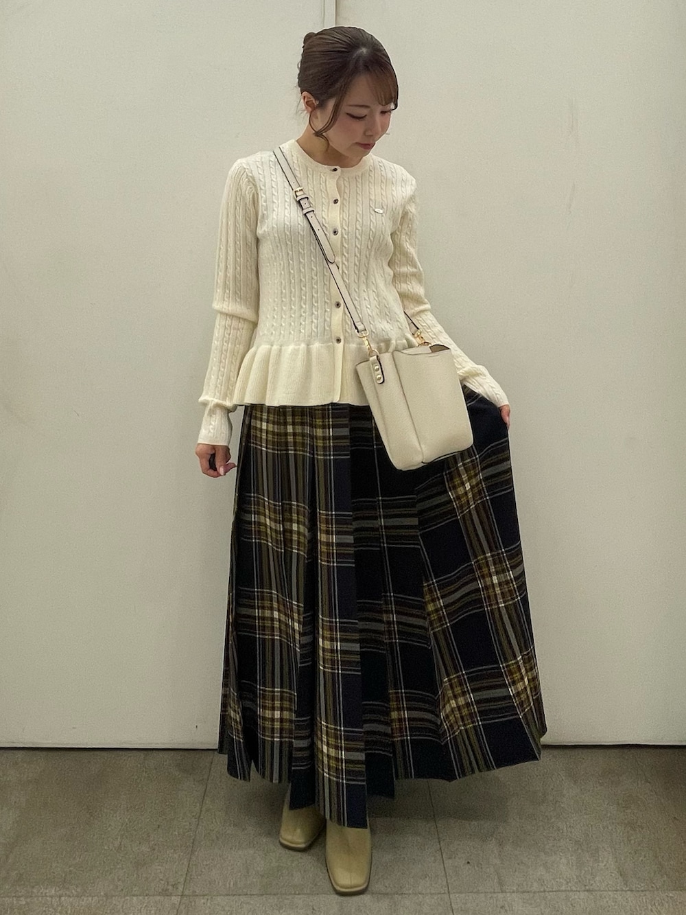 生地感やプリーツがしっかりしているので、この冬大活躍するアイテムです!色が落ち着いたチェック柄なので、どんなトップスでも合わせやすいと思います!