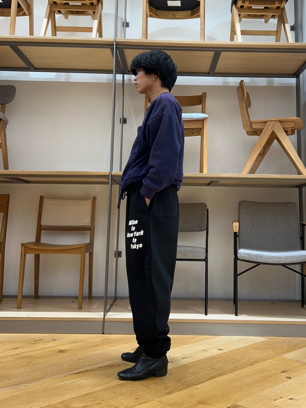 無骨にかっこよくスタイリングしました。短丈のトップスに絞りのついてるスウェットパンツ、靴はヒールブーツで合わせました。パンツに文字が入ってることでかわいらしさもあるはずです!