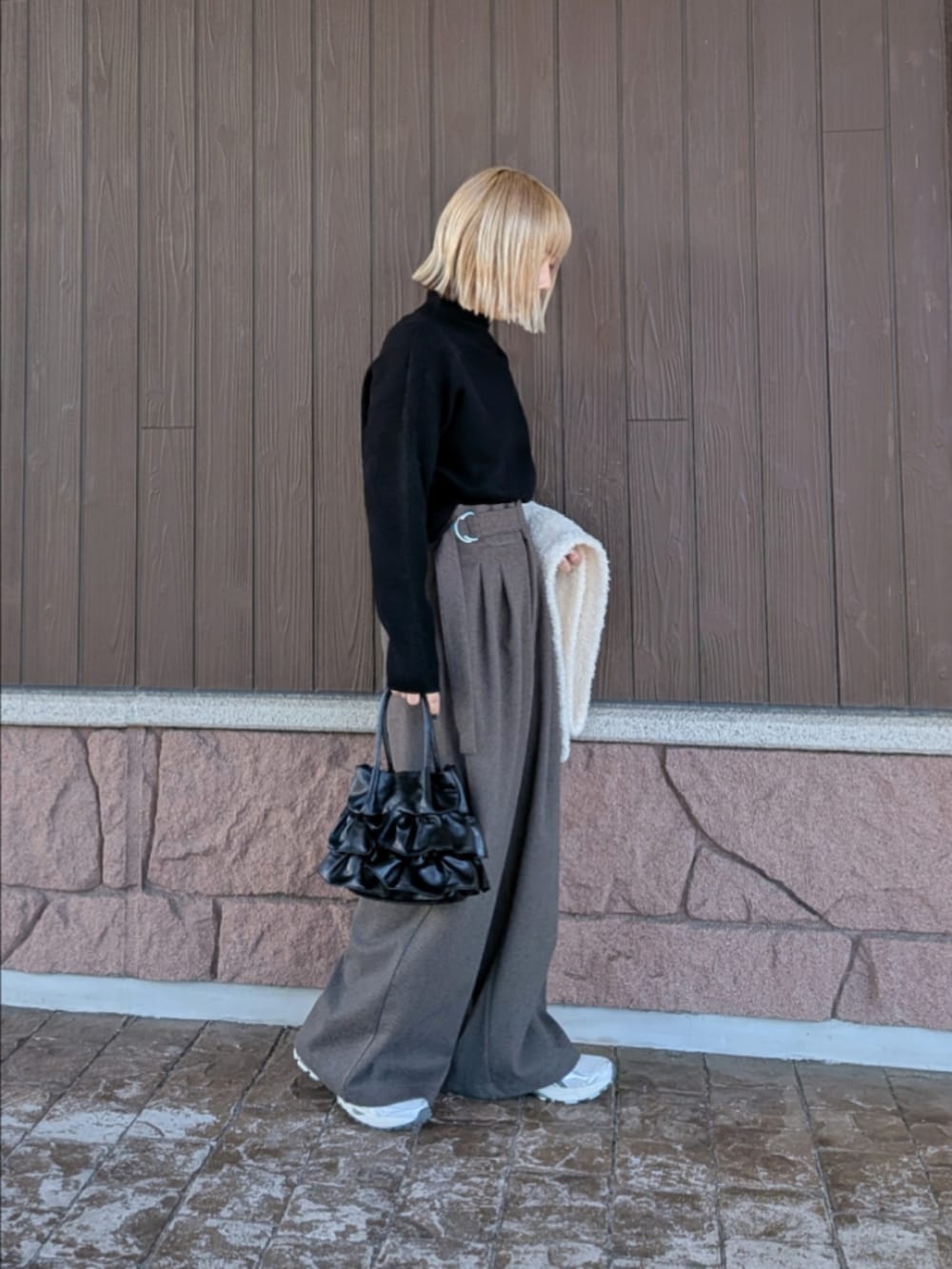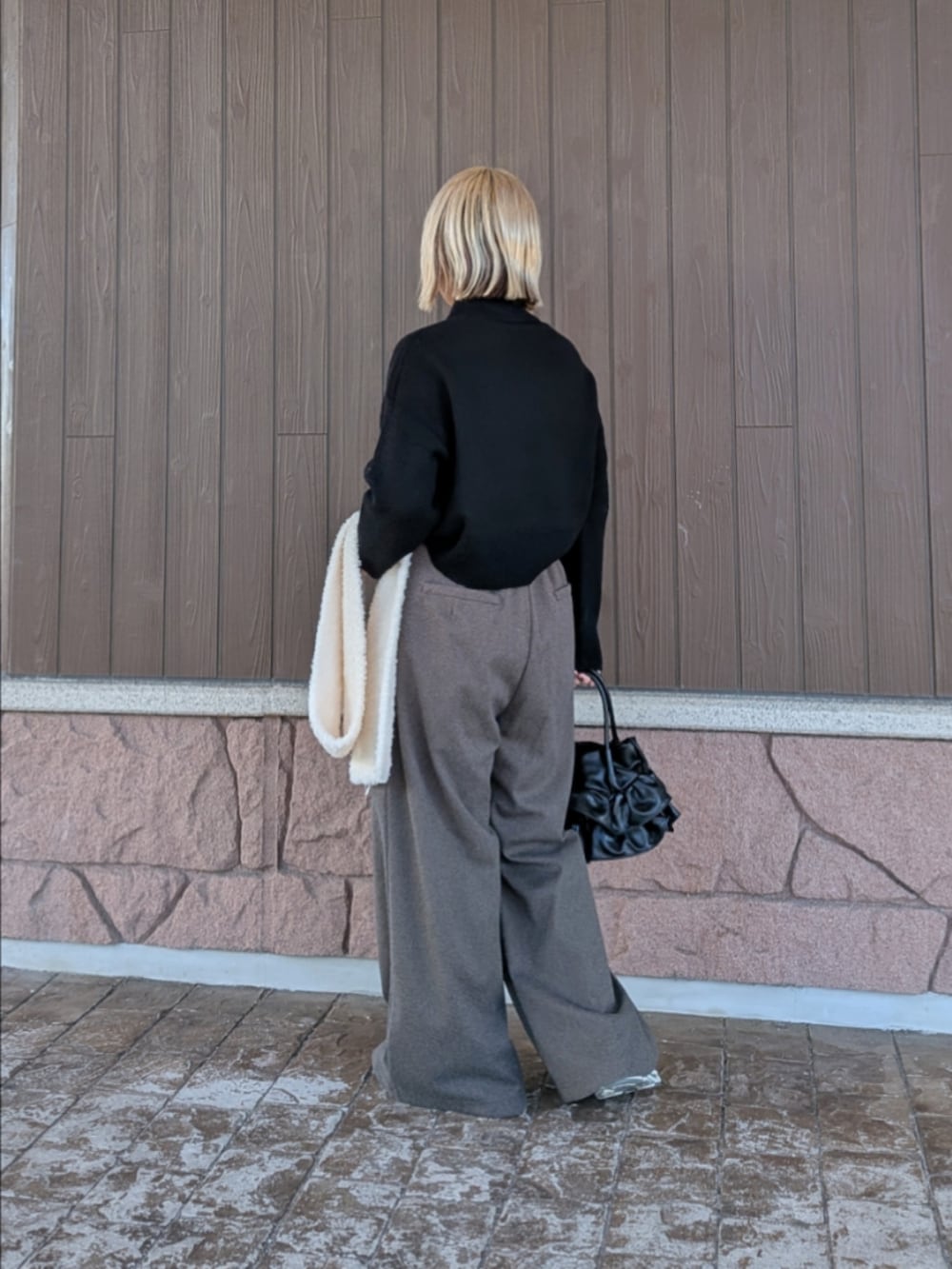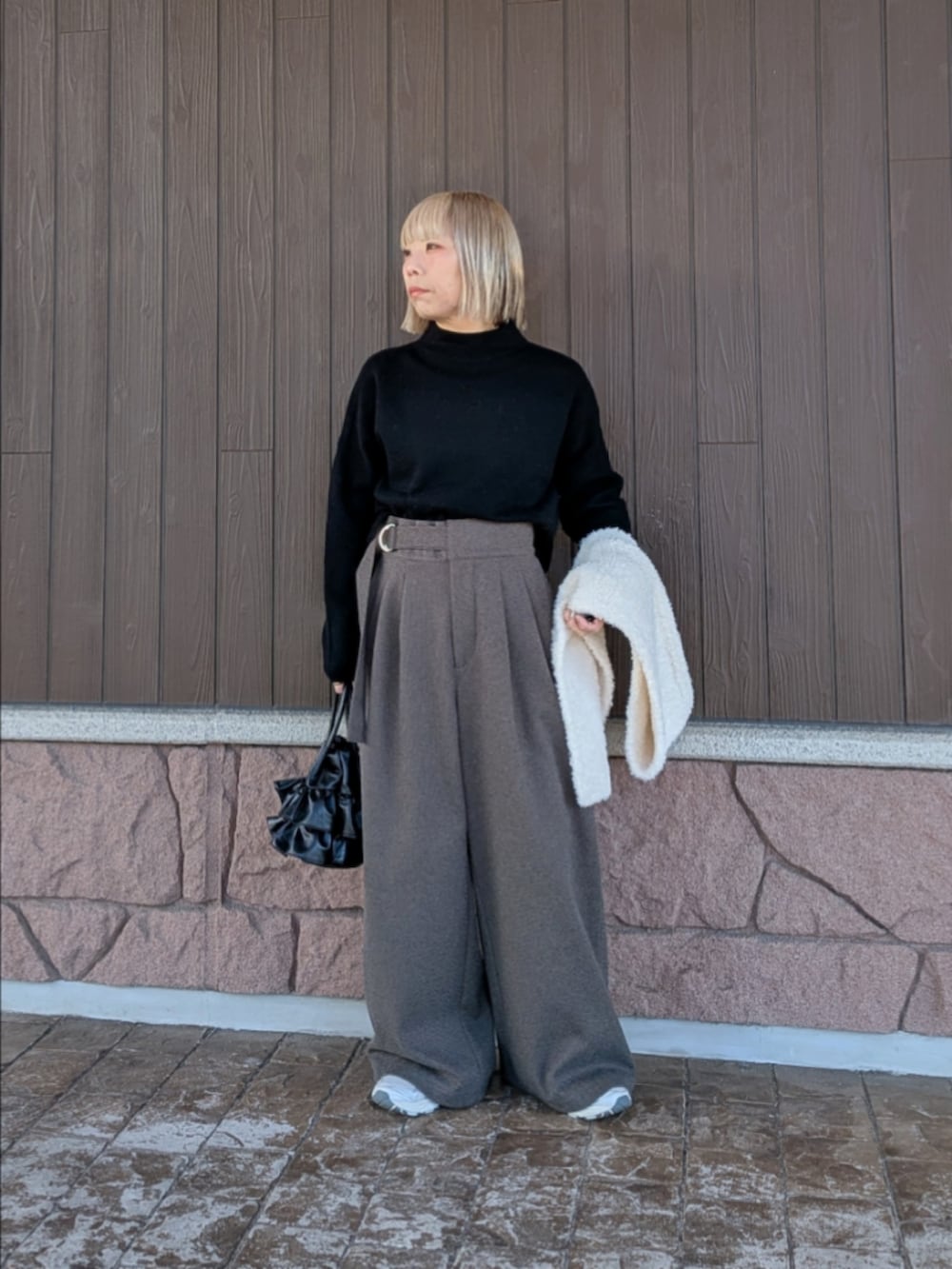 ハイネックのベーシックなニットはフワフワの生地で肌触りも良く着心地良しです。
