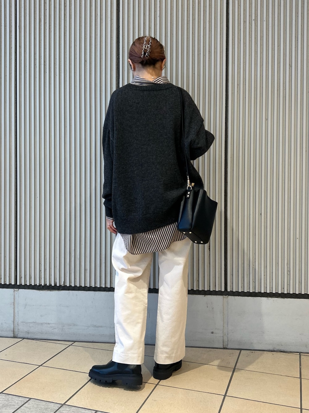 優しい肌触りのニットは、浅めのVネックでゆったりサイズ。インナー選びが楽しくなりますね。