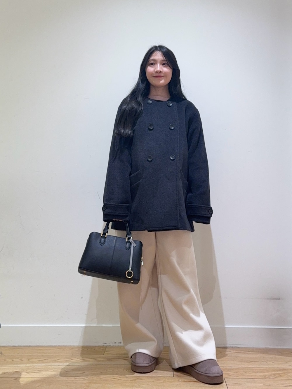 ウールノーカラーコートは、ダブルボタンがかわいくてきれいめにもカジュアルなコーディネートにも使えるのでおすすめです!
