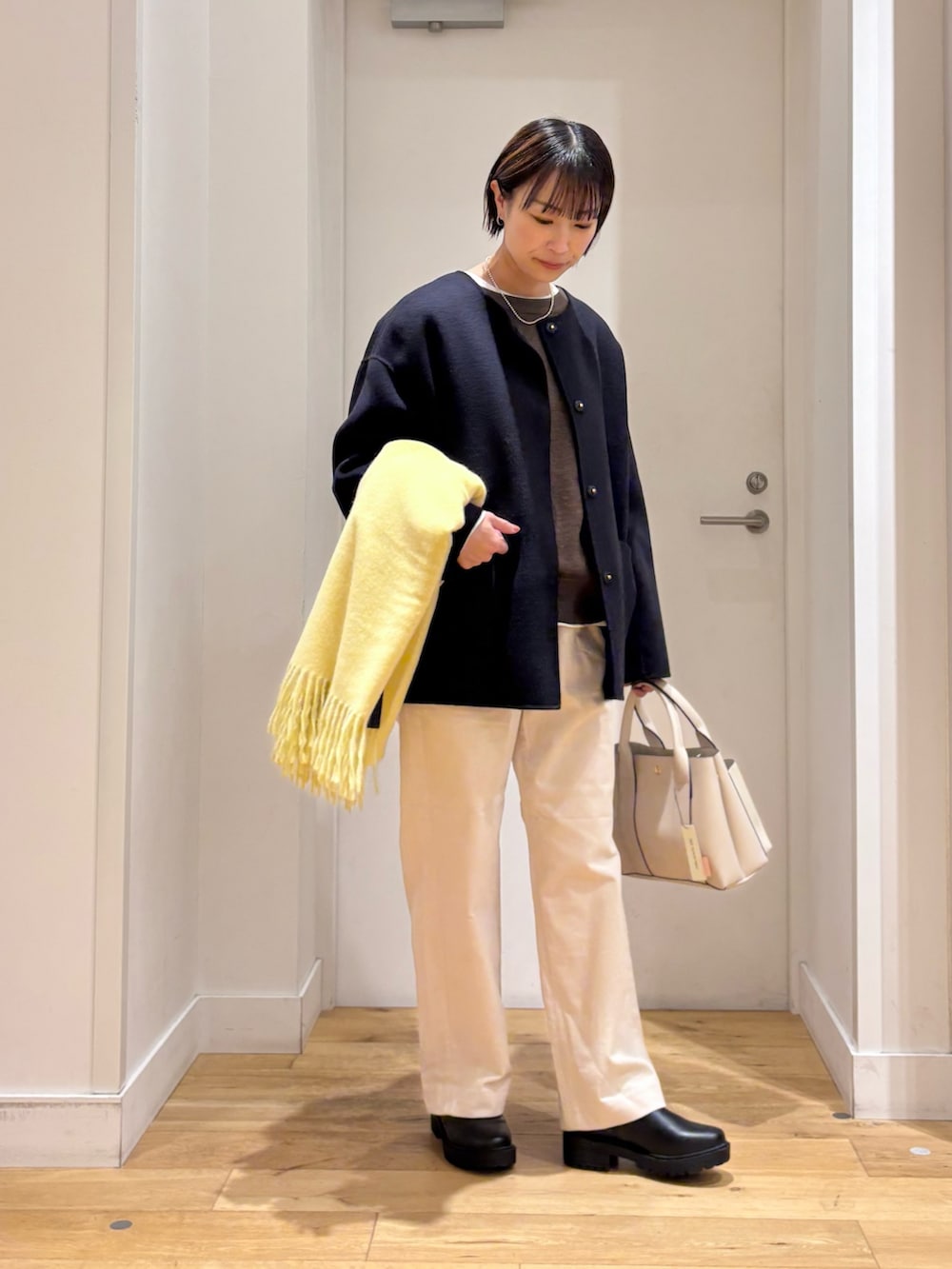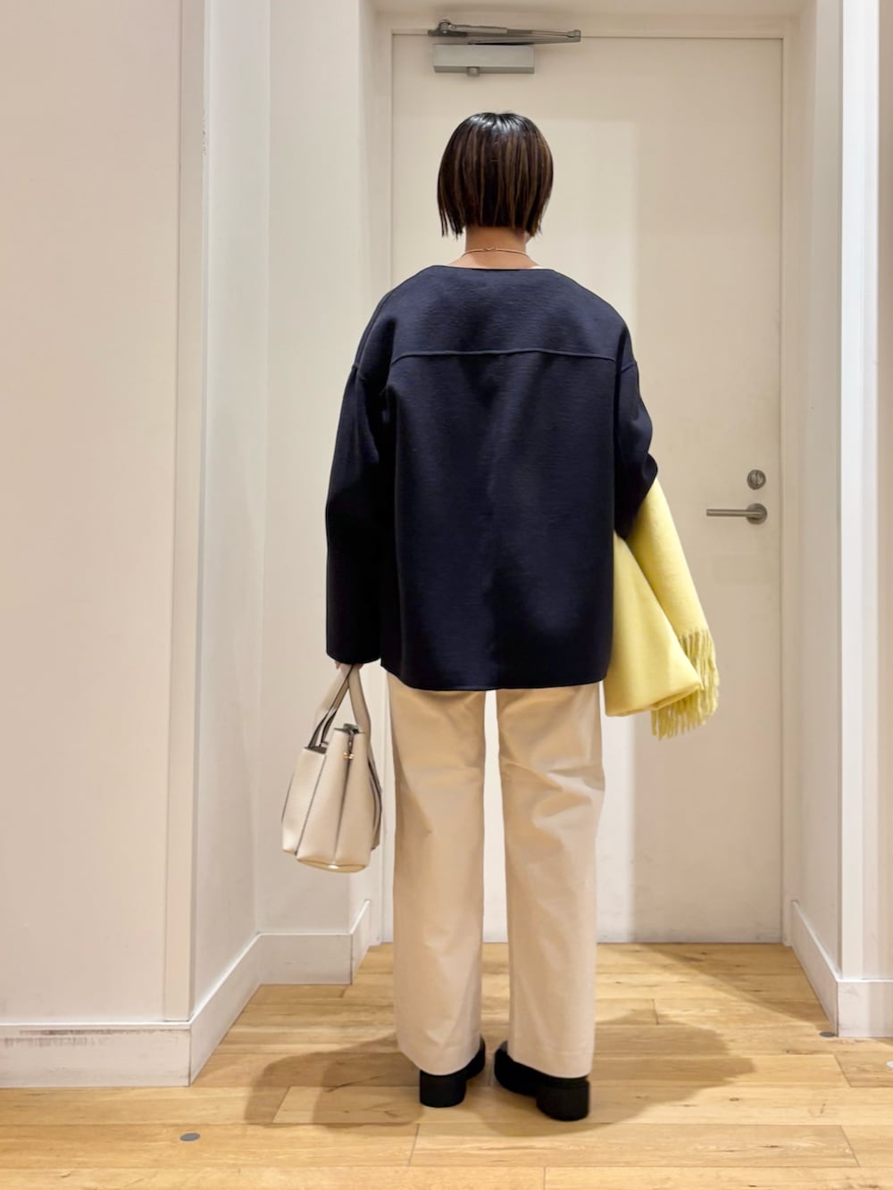 ノーカラーなので首元をスッキリと見せてくれて、タートルネックやストール合わせもしやすいですよ!