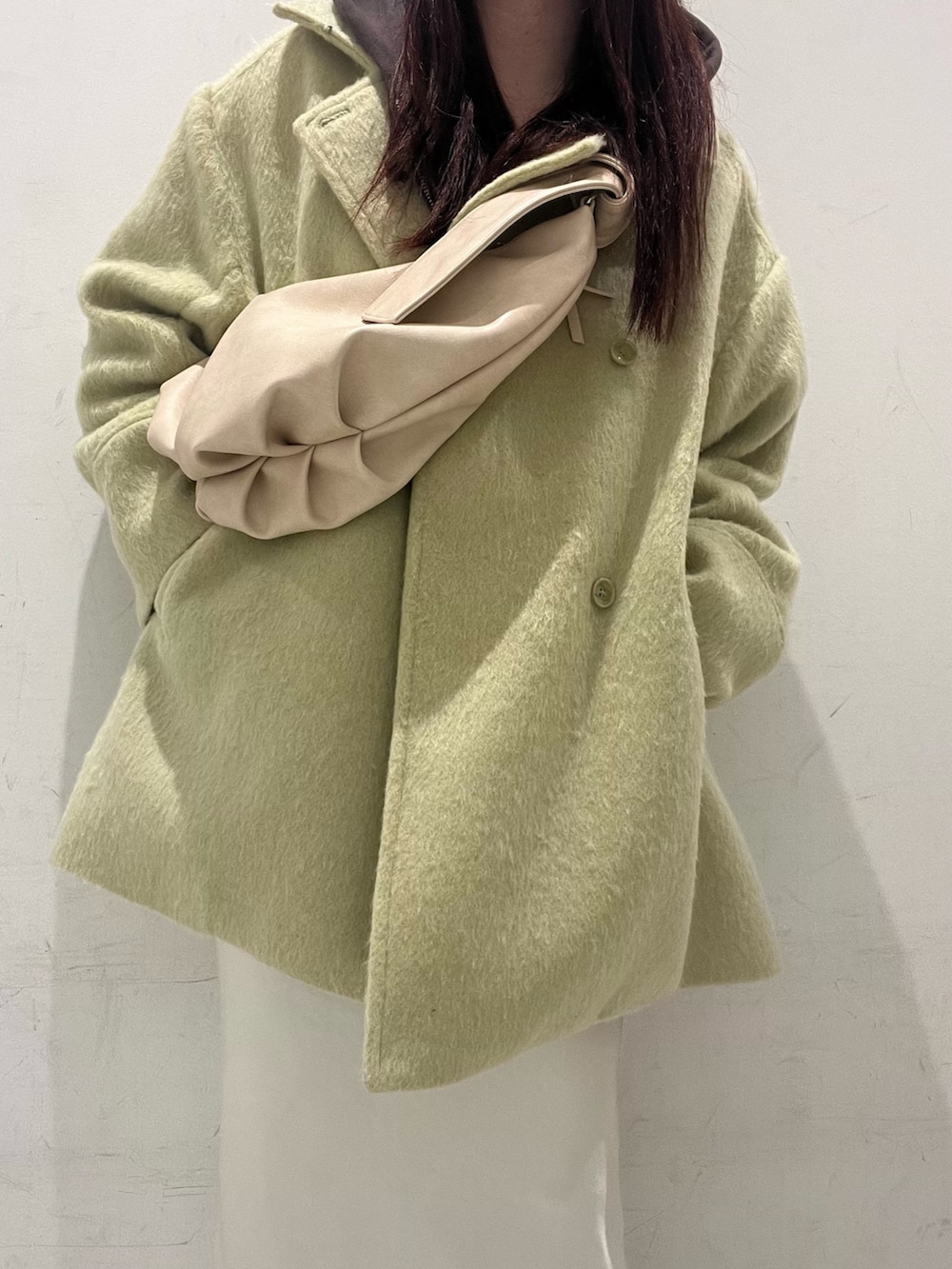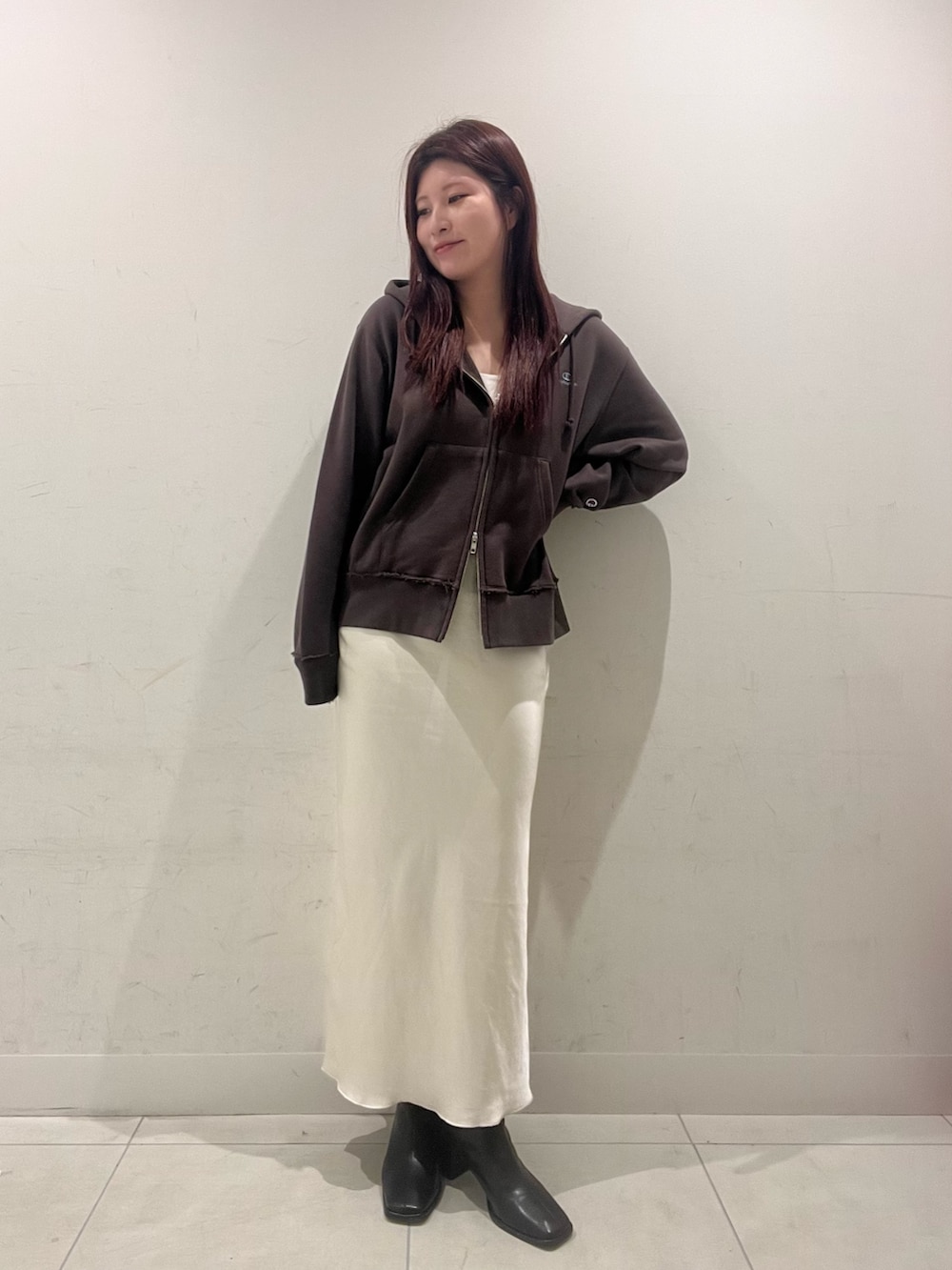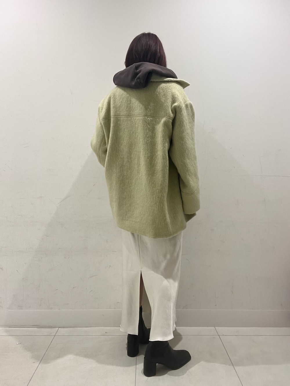 人と被らないイエローベージュのシャギーコート×ダブルジップのchampionパーカー×タイトめなサテンスカートで柔らかいコーデに♪新作のバック柔らかい生地でアウター合わせが可愛いです◎