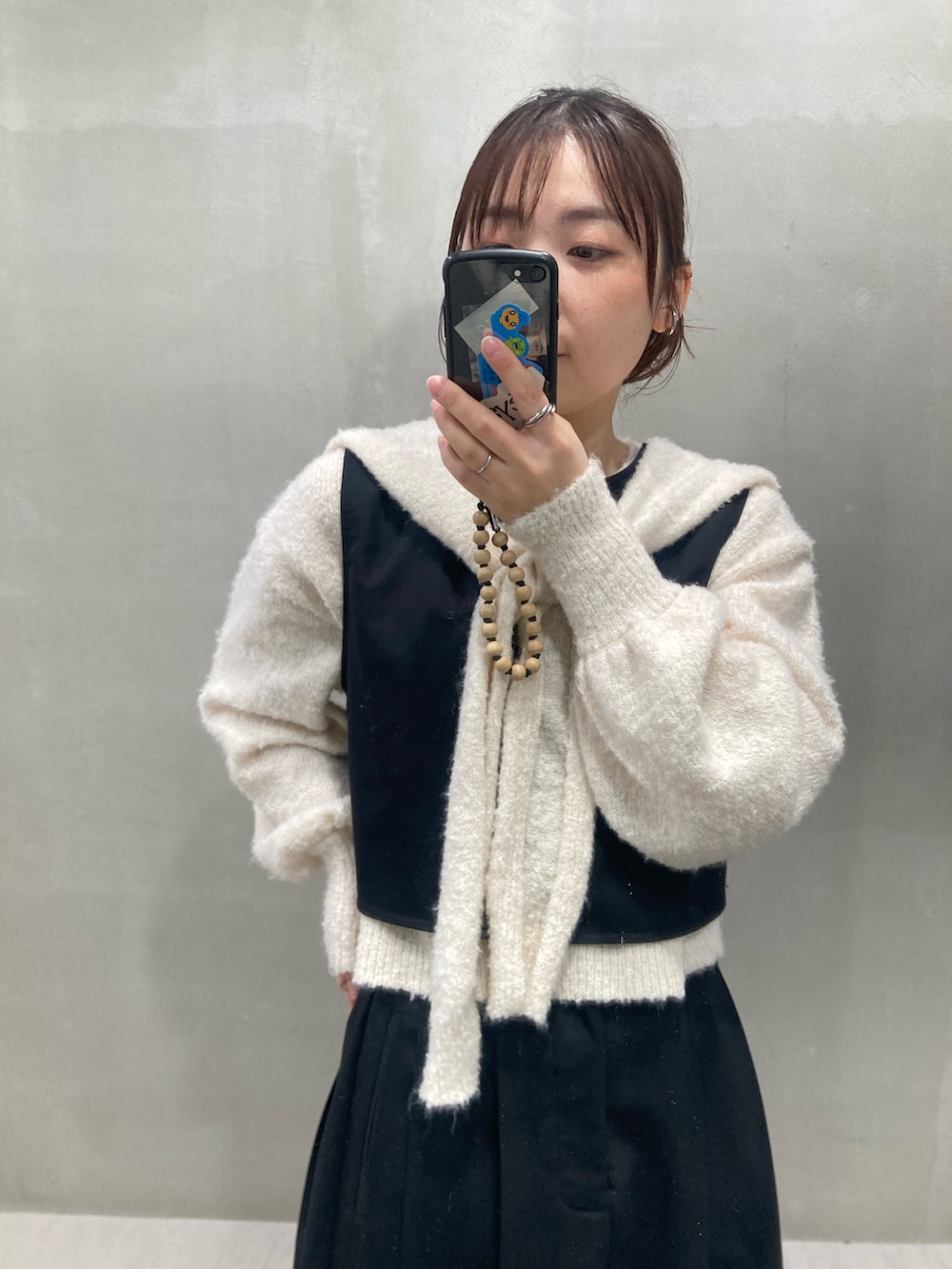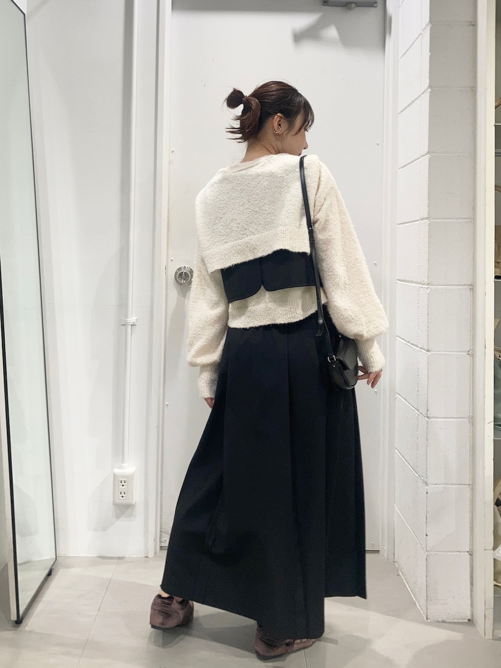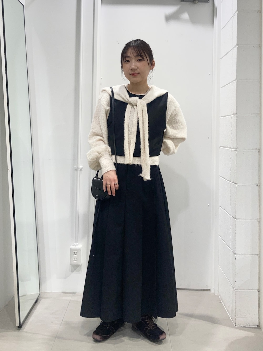 ワンピースを黒にしたので、ニットの白でかわいいをプラスしました!