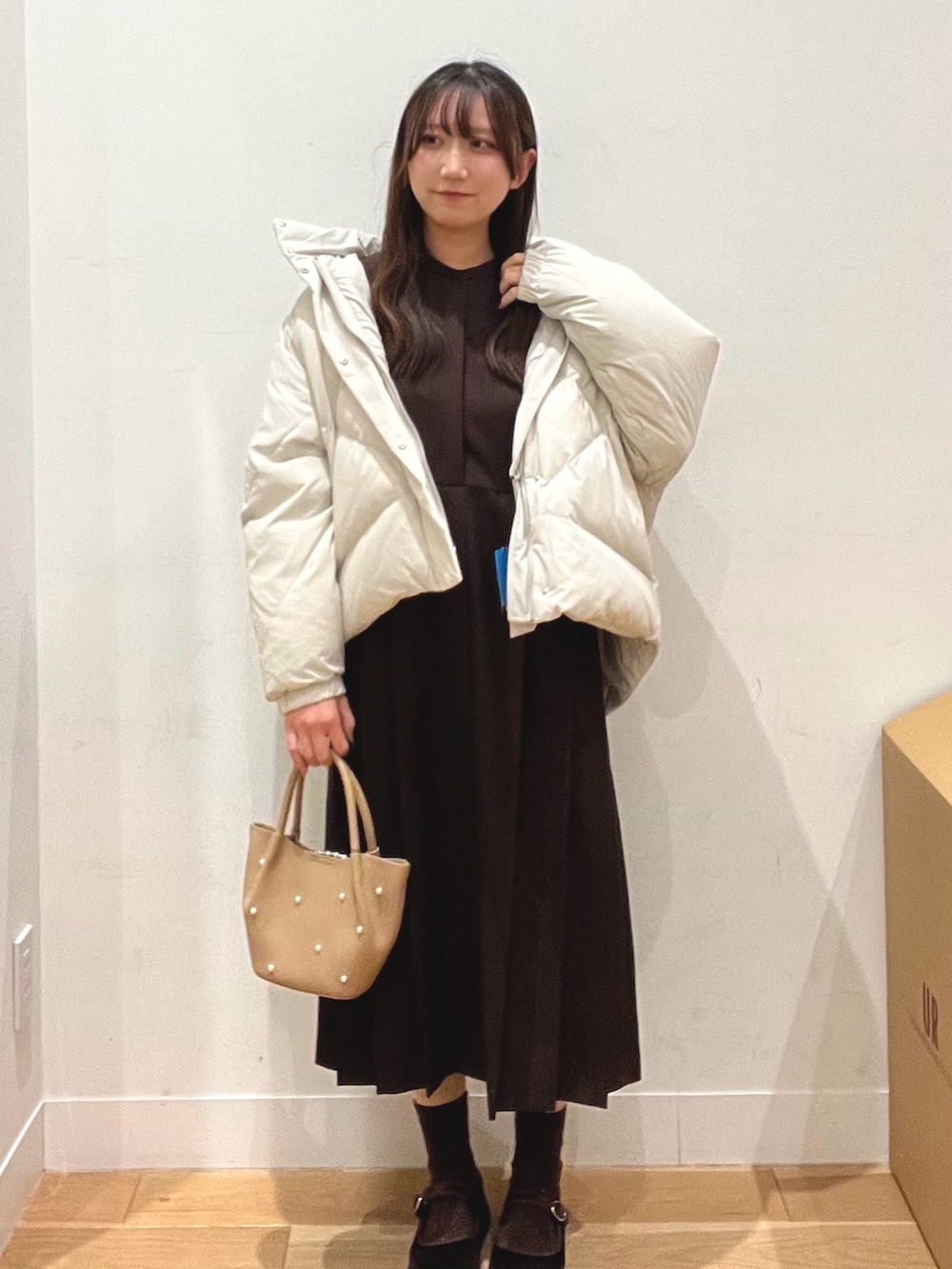 白のダウンジャケットをメインに、女性らしい冬コーデを組みました。❄️