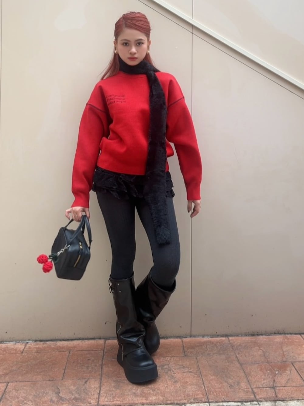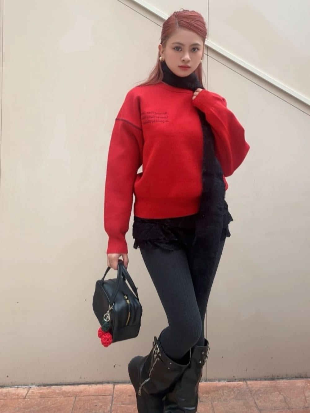 ラフさと女性らしさをバランスよく融合させた、デイリーにも取り入れやすいアクセントコーデ。