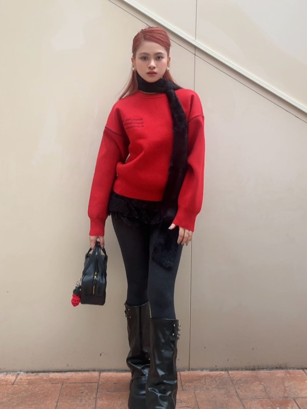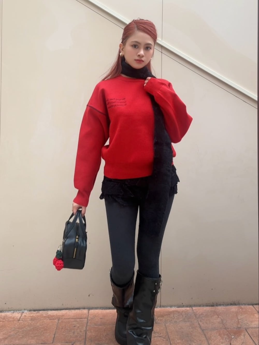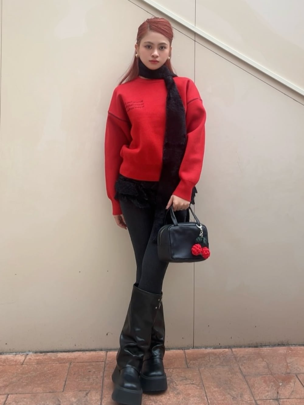 そこにシャギー素材のナローストールをプラスすることで、柔らかな表情と奥行きを加え、シンプルながらも印象に残るスタイリングに。