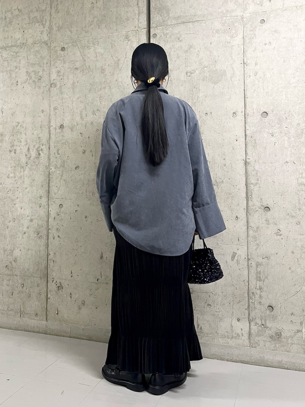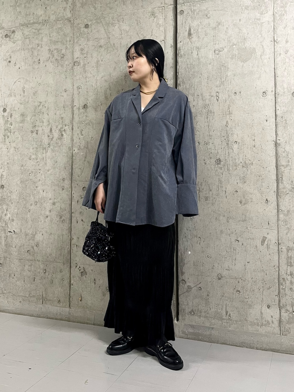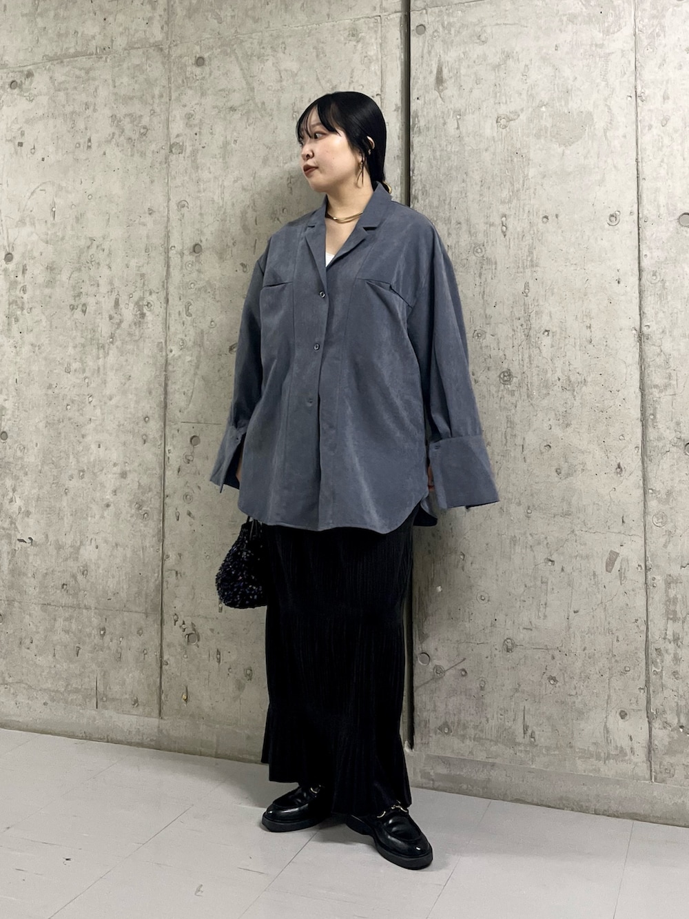 大きめのシャツですが、すっきりとしたスカートと合わせるとバランス◎
