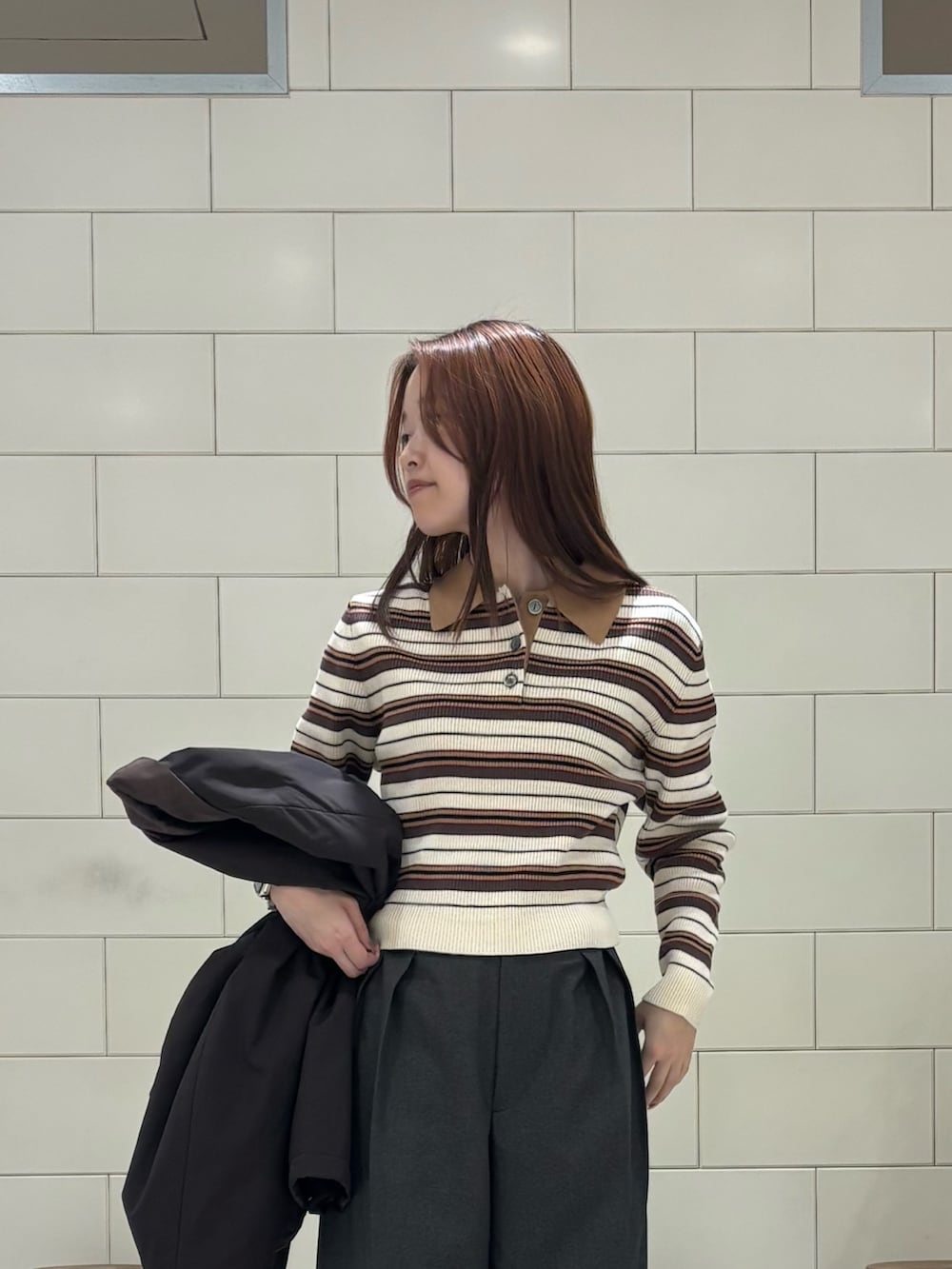 配色が可愛いボーダーポロ衿ニットです。コンパクトな丈感がスッキリ見せてくれるのでボリュームのあるボトムスと相性◎