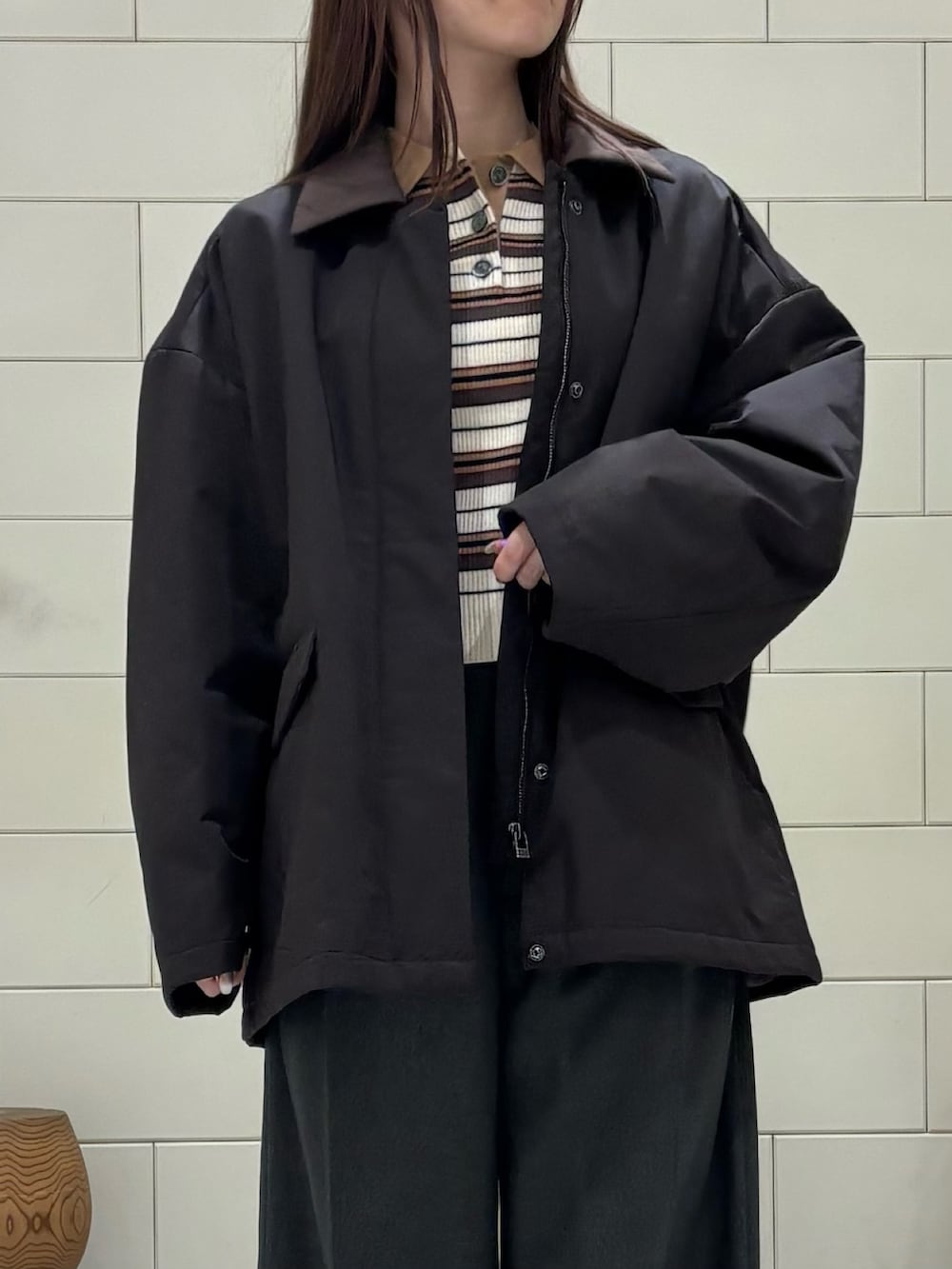 異素材ミックスなデザインが特徴の中綿コートです。ゆったりとしたシルエットがこなれ感が出てスタイリングを引き締めてくれます。
