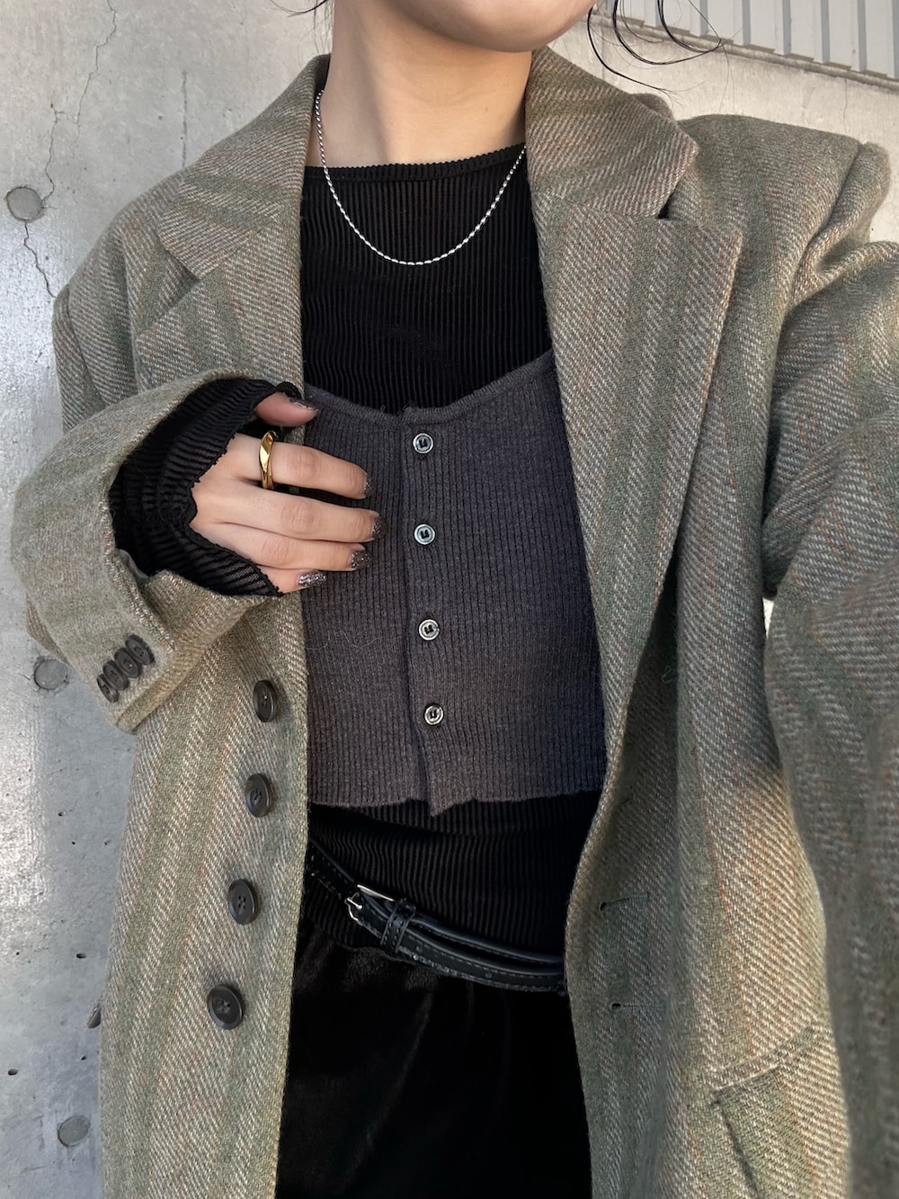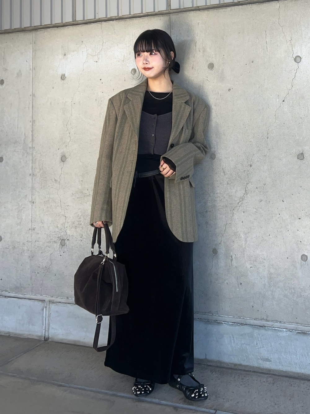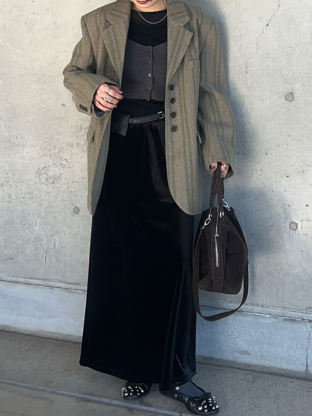 ヴィンテージ感があるジャケットにベロアスカートを合わせて綺麗めな合わせにしてみました!