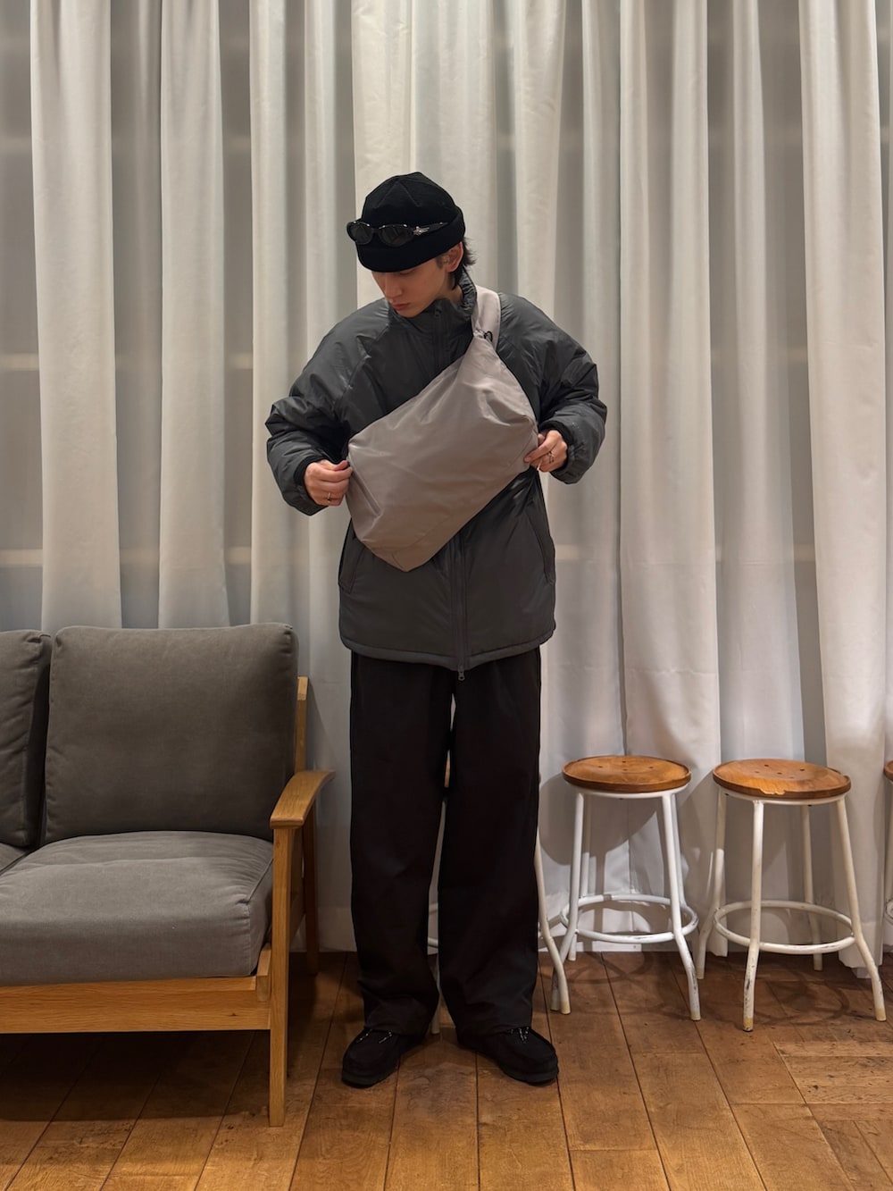 YAKPAKのショルダーバッグの新色グレーを使用した、機能性バツグンのアウトドアスタイルです✨️