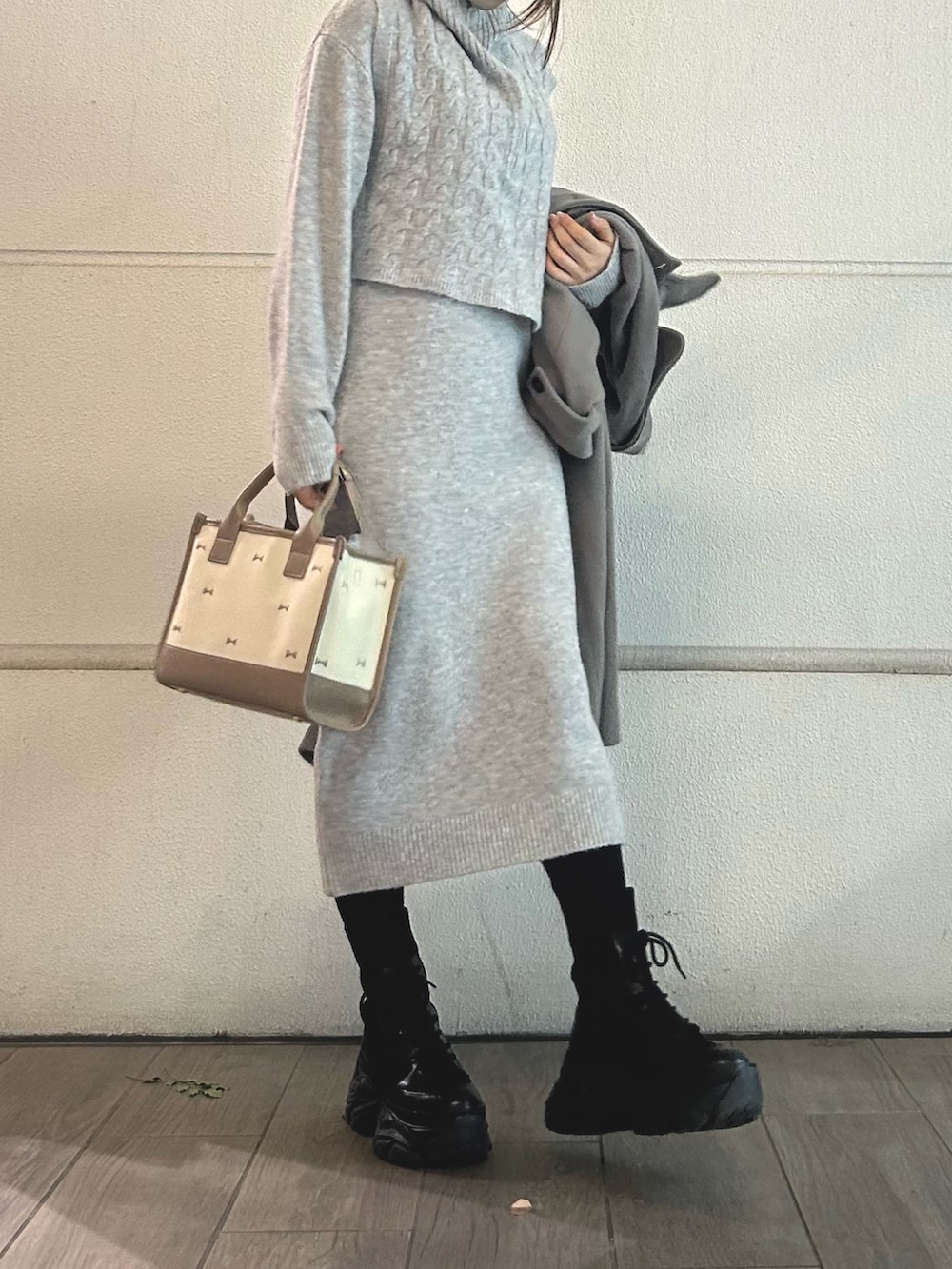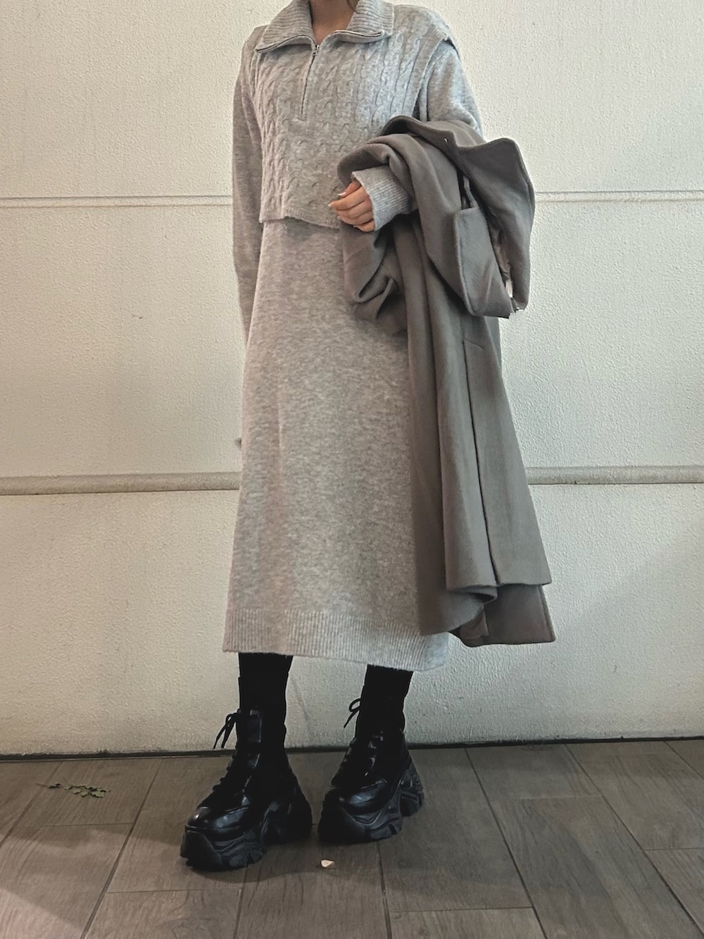 ニットワンピースのハーフジップは、きちんと閉めても、ラフに開けていても可愛いです🧶