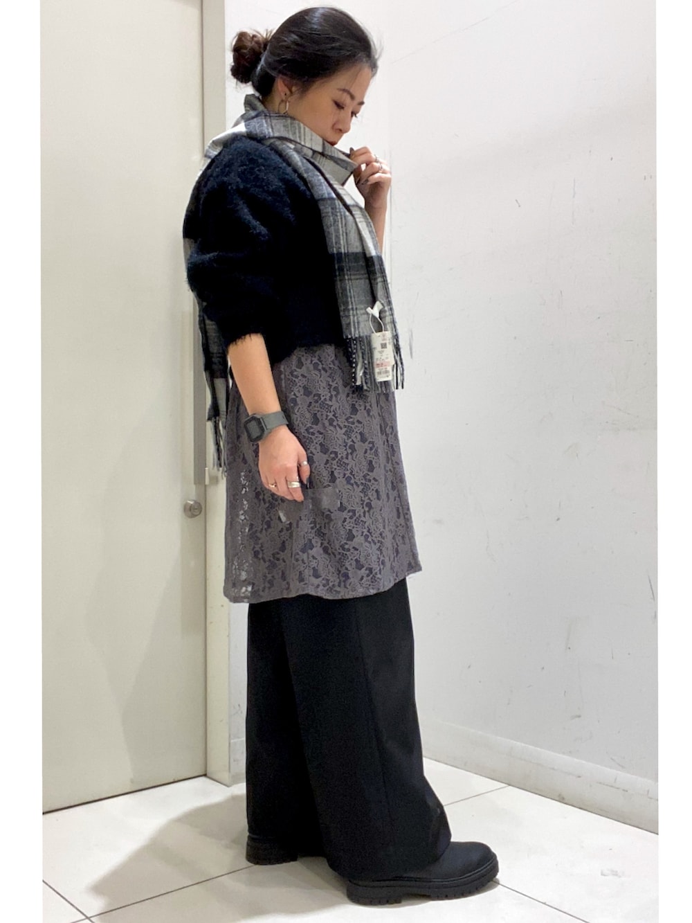 この時期必須アイテムのマフラーもモノトーンで統一感もありつつ、しっかり防寒も◎