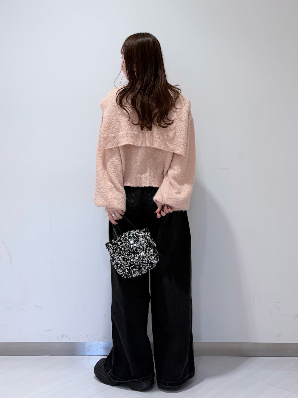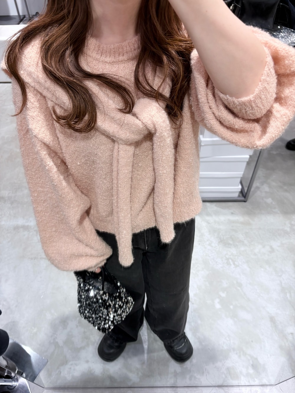 肩掛けしたようなデザインのニットで、そのまま垂らしたりタスキ掛けしたりアレンジも出来ます✊🏻