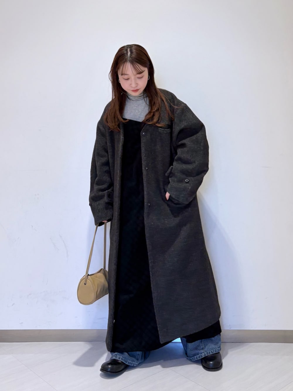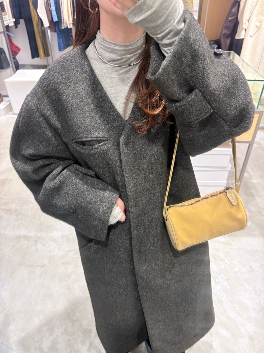 小顔効果も発揮するVネックラインでロングコートでもスッキリ見えが叶います☝🏻