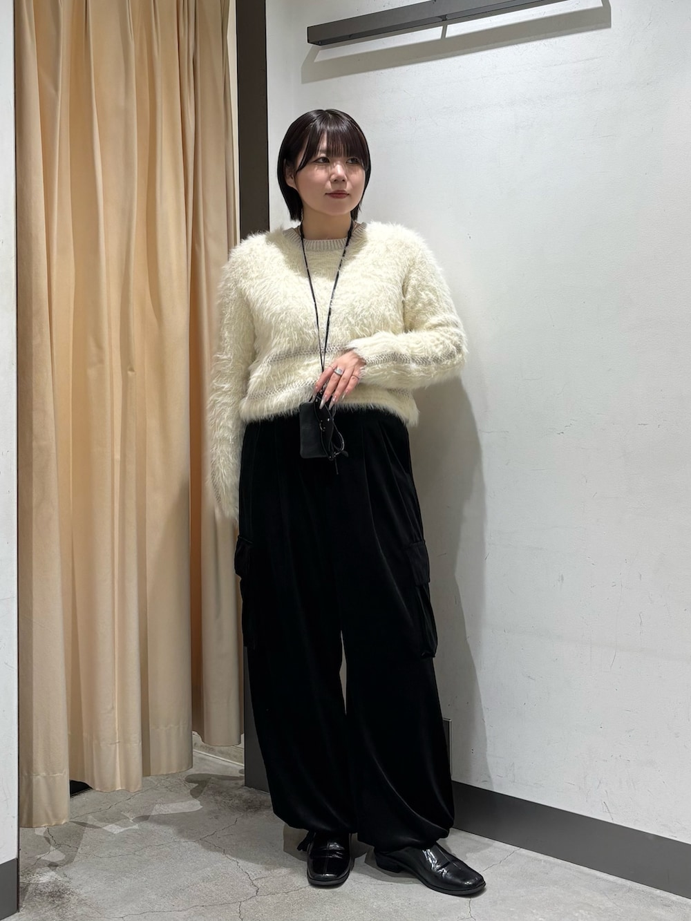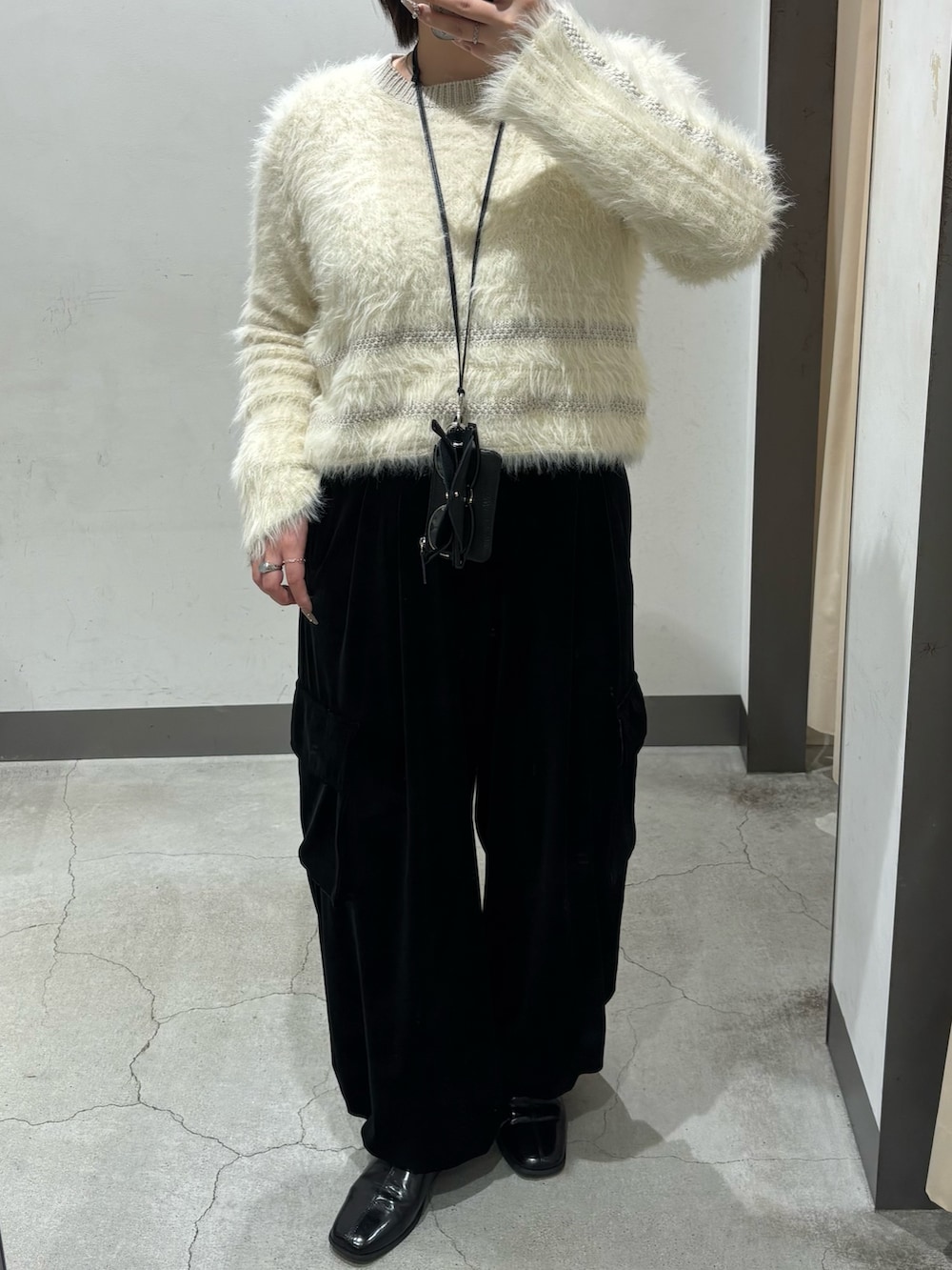・シャギーで上半身の厚みが目立ってしまうので、ボトムスに落ち感のあるベロアのパンツでスッキリ見せ!全身のバランスが取れるようにしてみました.ᐟ.ᐟ.ᐟ