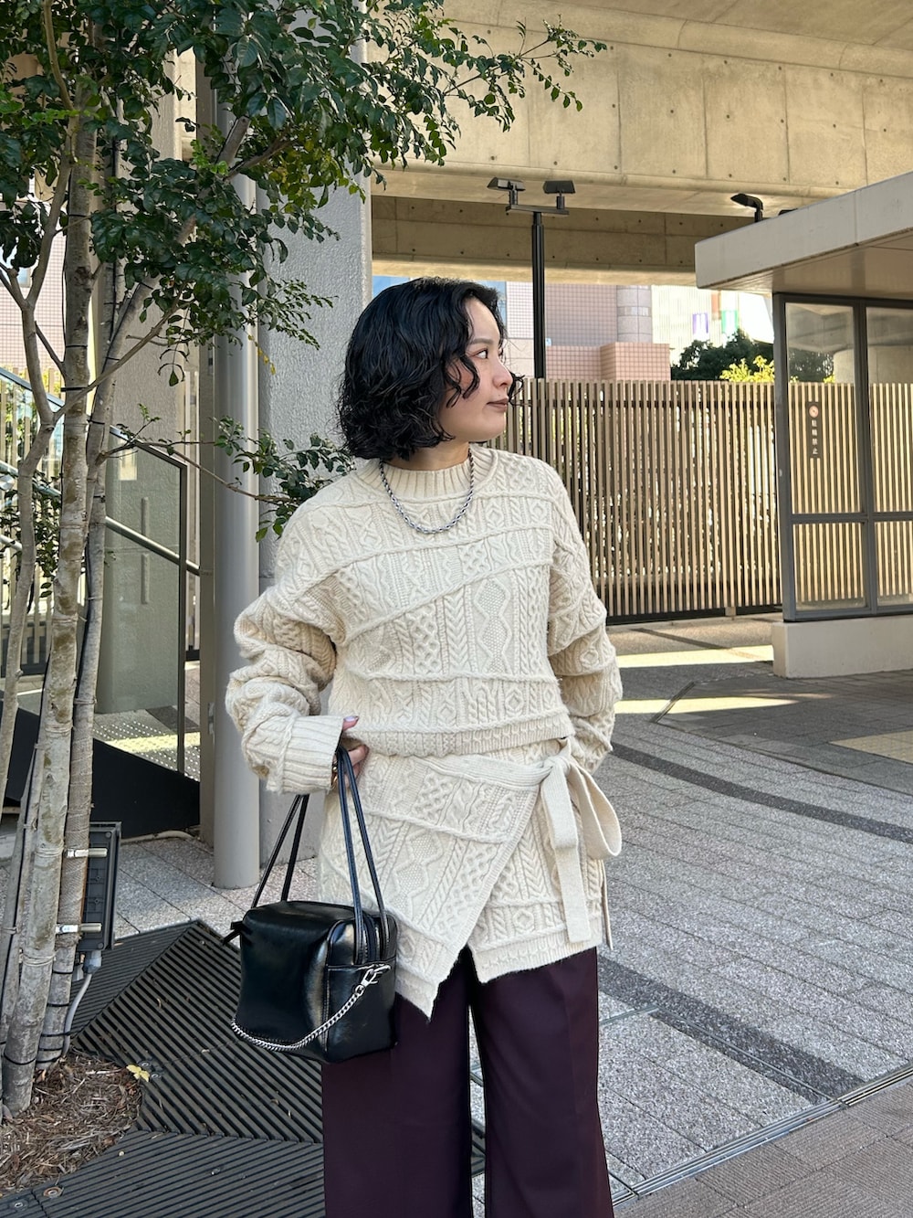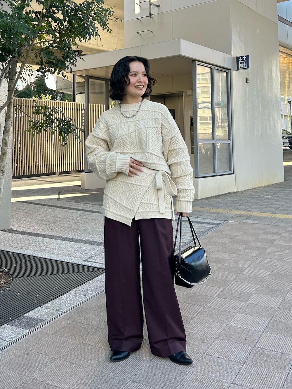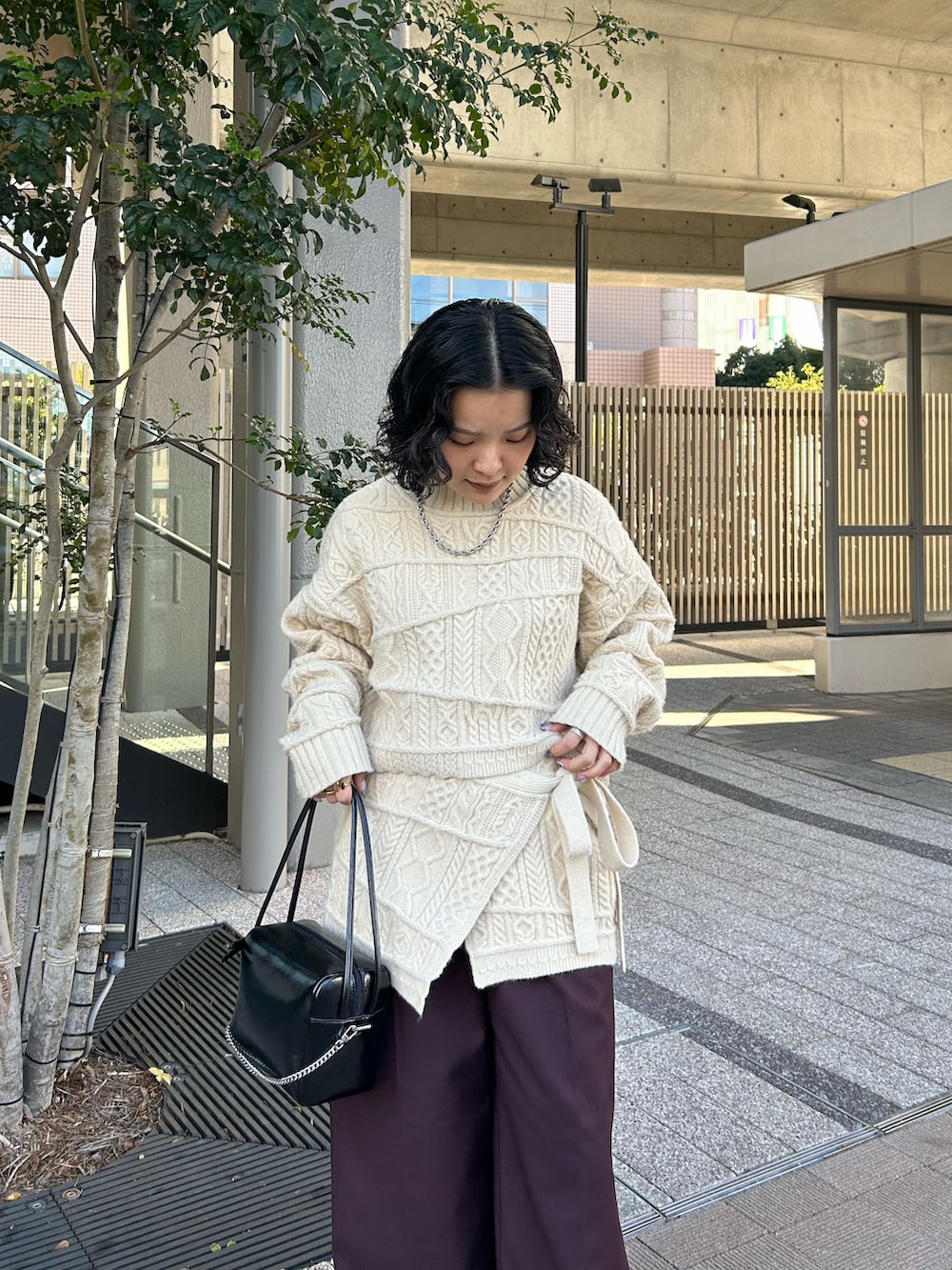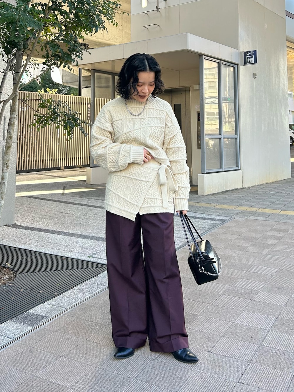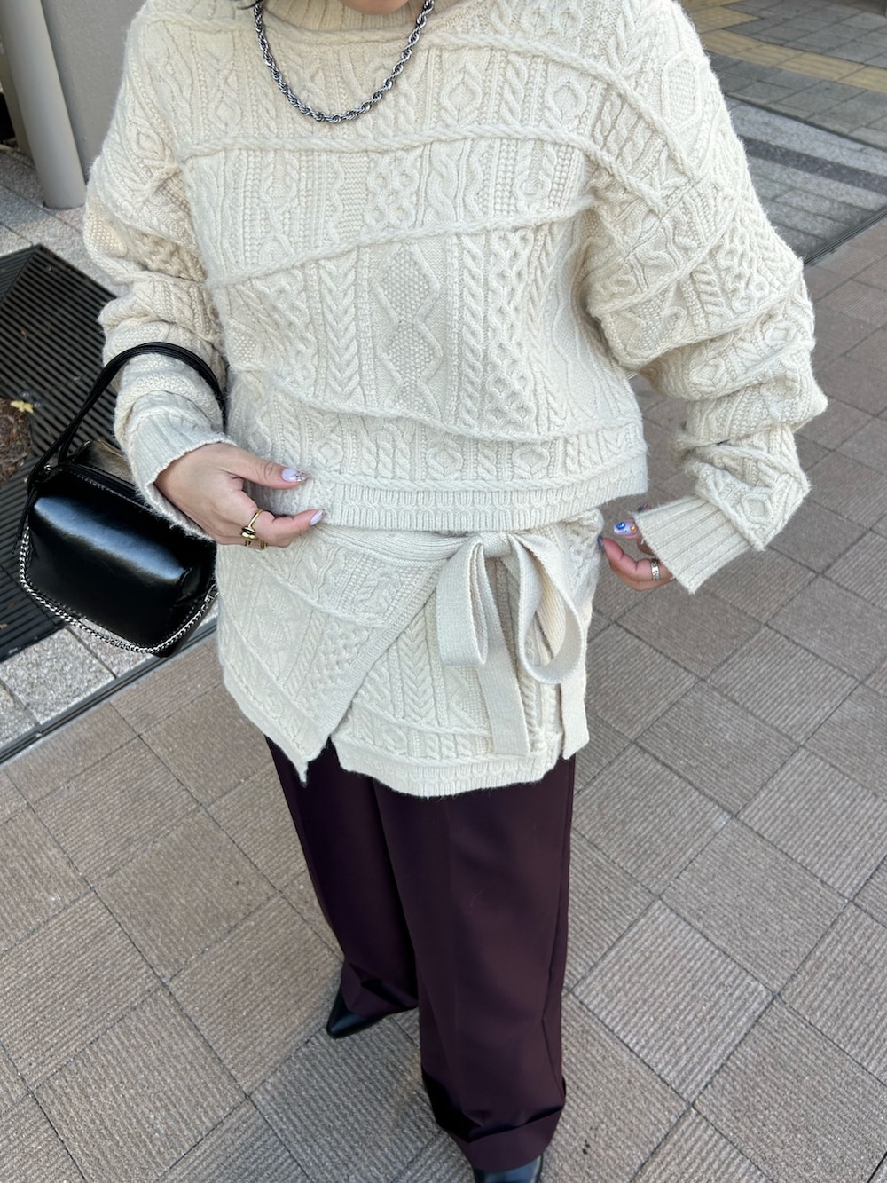ランダムなケーブル網みがかわいいニットを スカートとセットで合わせました!