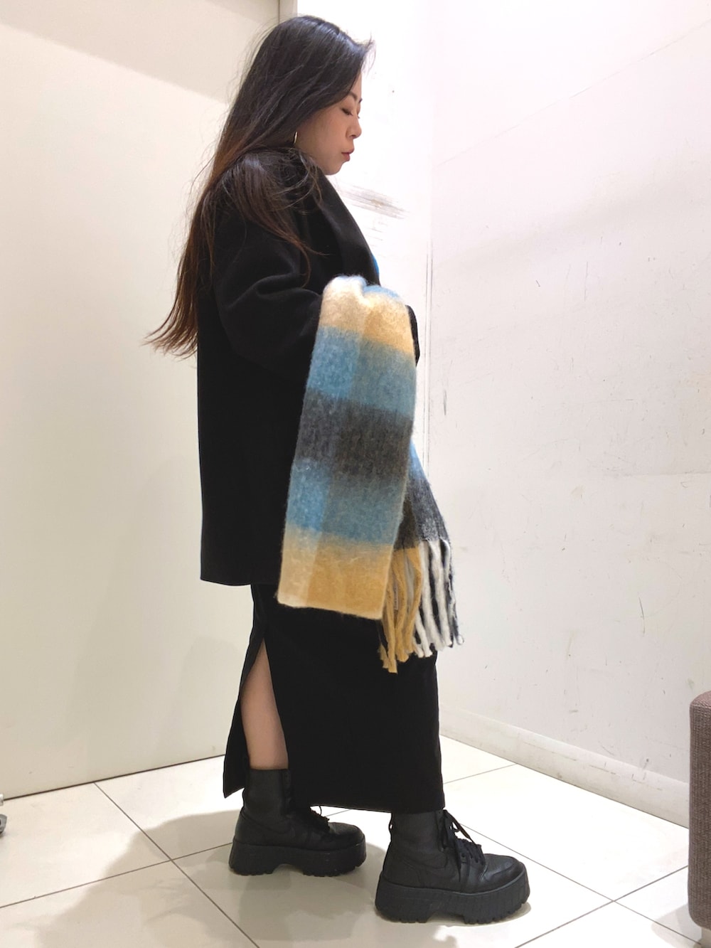 黒を多めにする事で、引き締まるのと、マトンスリーブセーターのブルーを目立たせたコーデ。