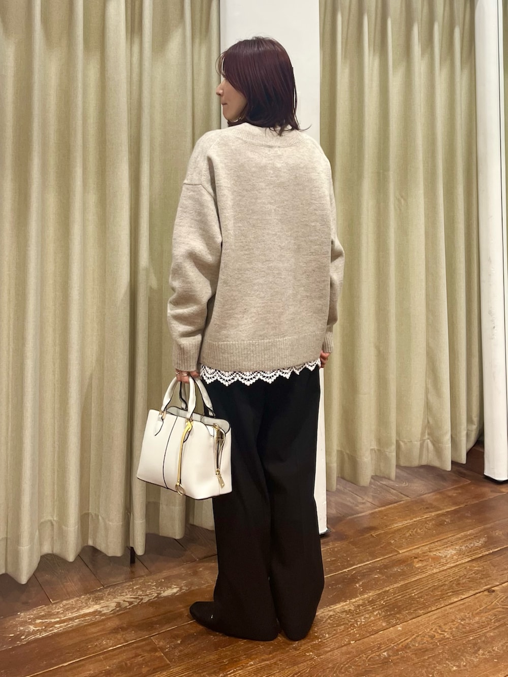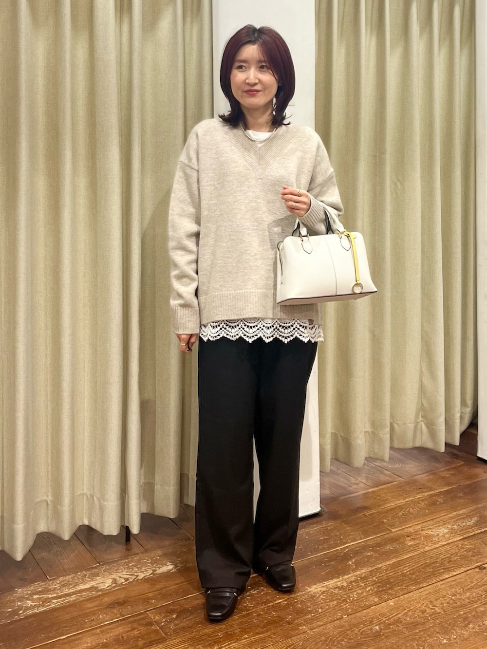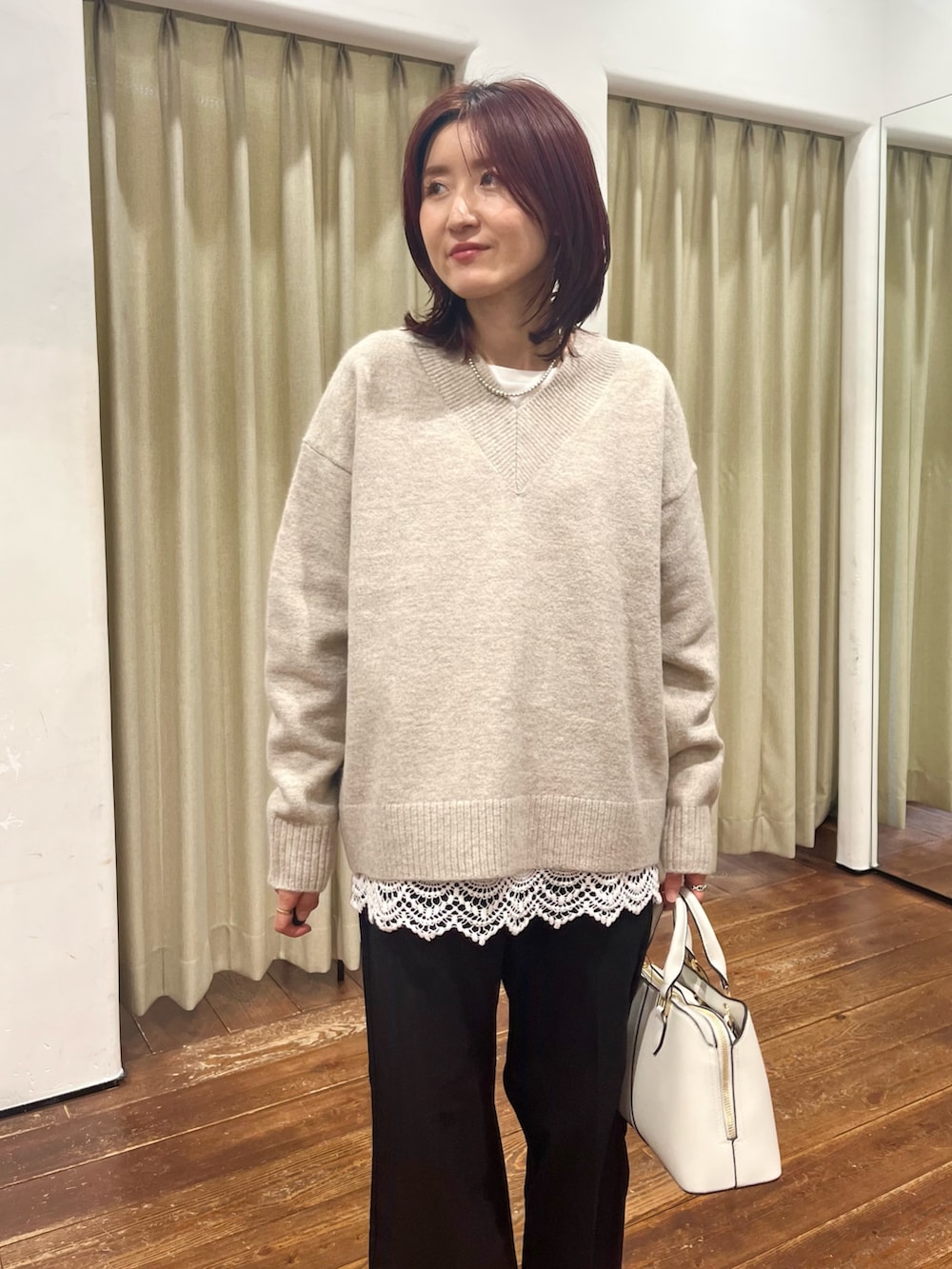 ニットにはレイヤードで裾がレースになっているカットソーを合わせました。雰囲気が変わるのでおすすめです◎