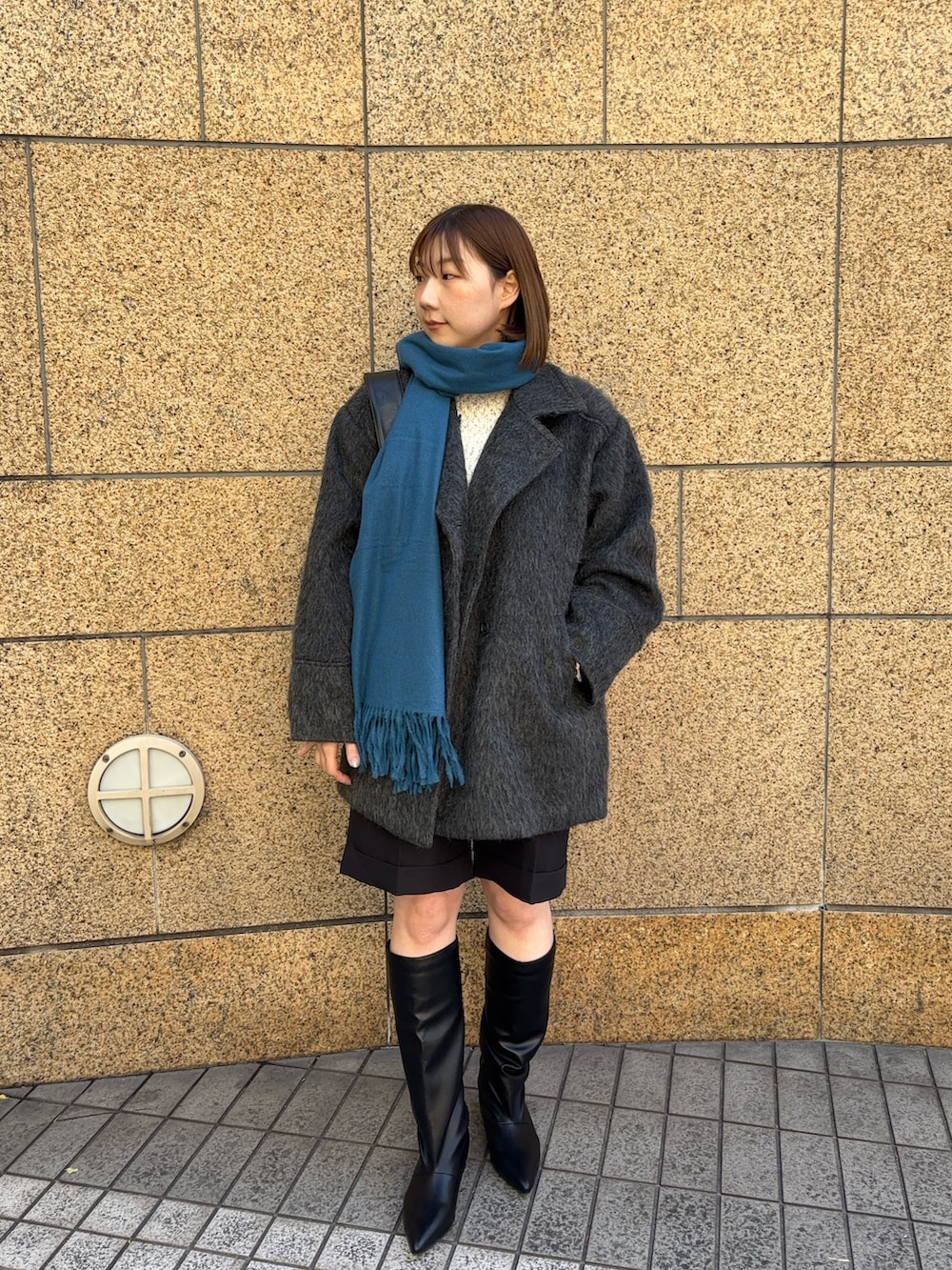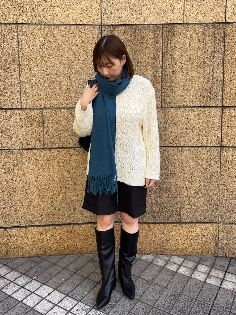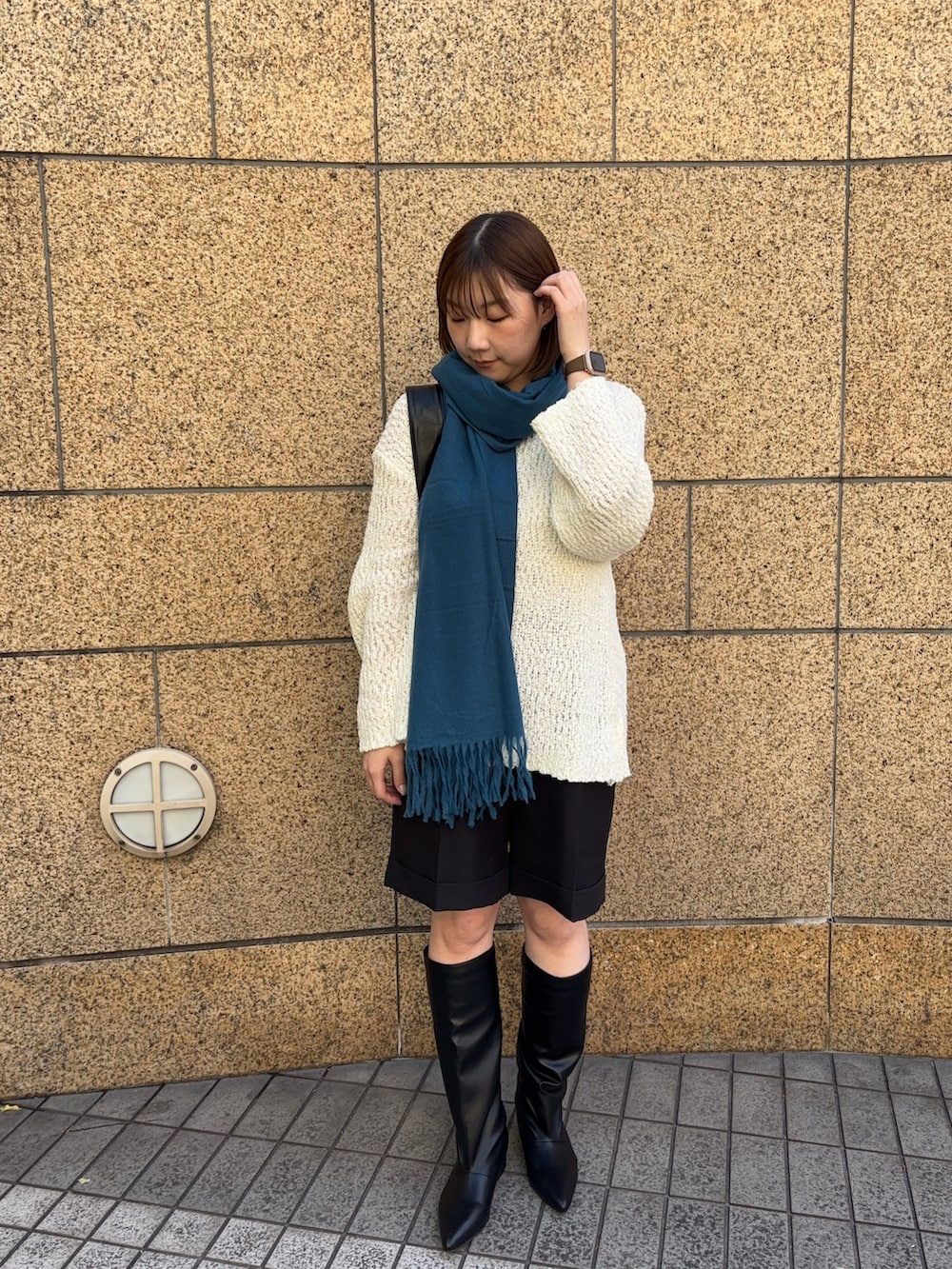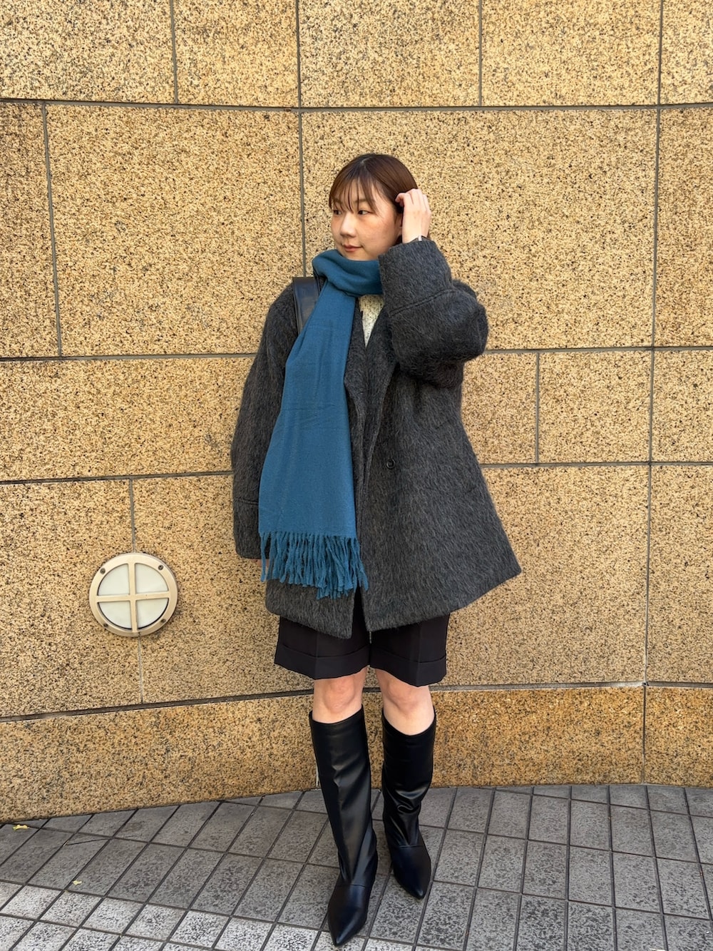 アウターを羽織ると上半身の厚みが気になるのでショートパンツ+ロングブーツで着痩せ効果も!!骨格ストレートの方におすすめコーデです🤍