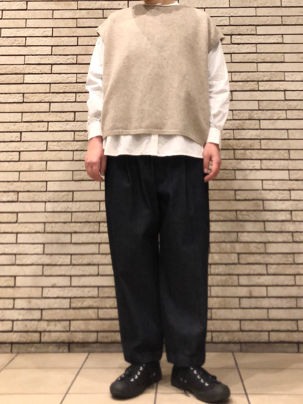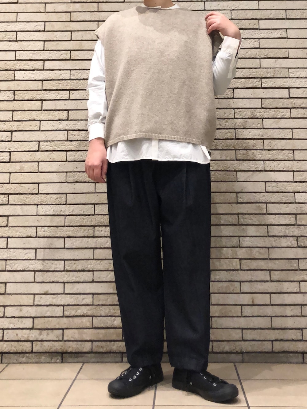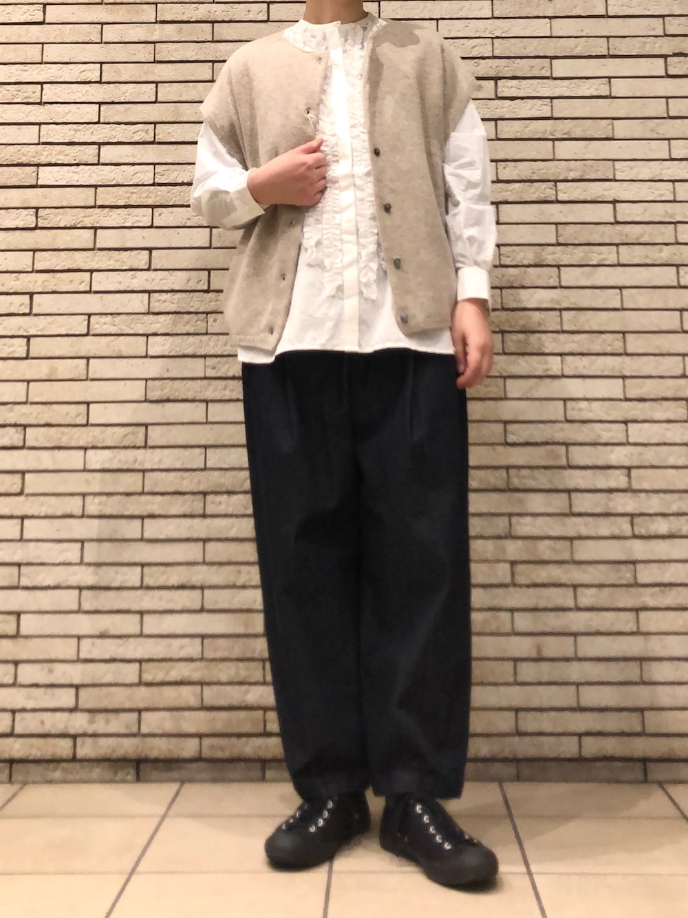 今回はベストと合わせたレイヤードスタイルです。ベストは柔らかくて羽織りやすく、前後2WAYでスタイリングしていただけます。