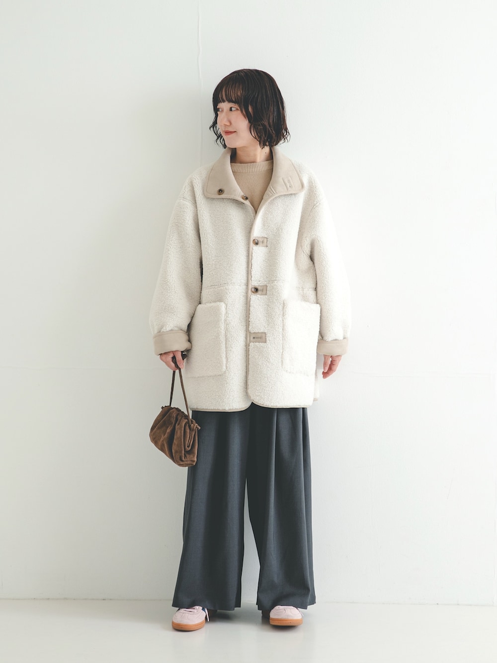 繊細な起毛感のフェイクスエード生地と、柔らかな風合いのボアを使用したフェイクムートン素材です。