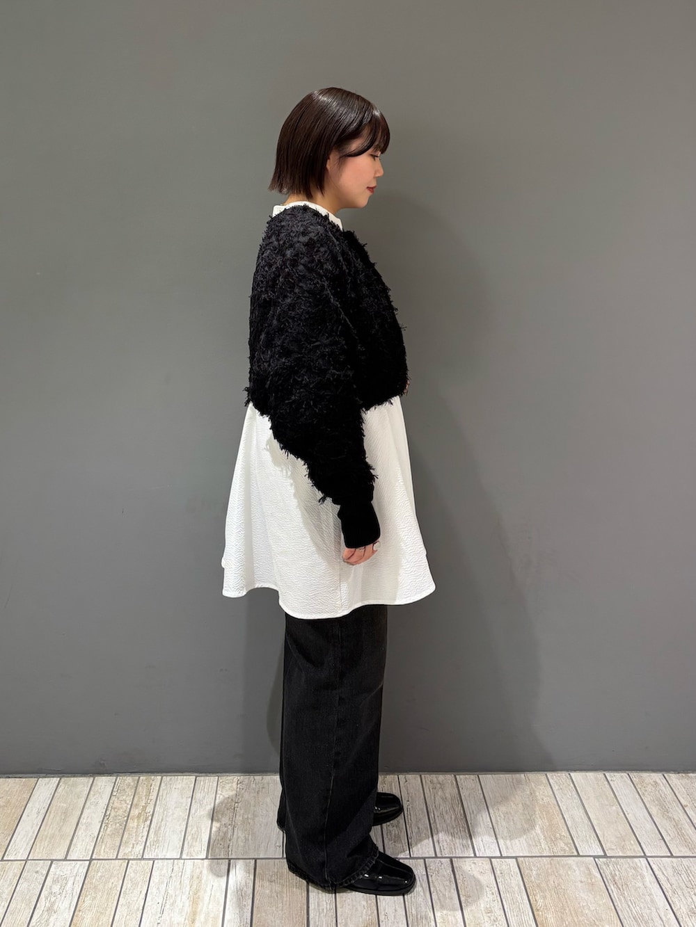 着てみた感じ、ショート丈ですが骨格ストレートの私の上半身が大きく見えることもなくスッキリめに着ていただけます!