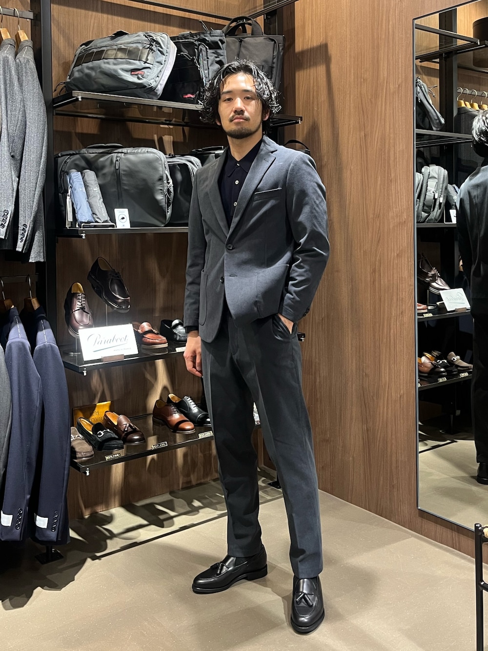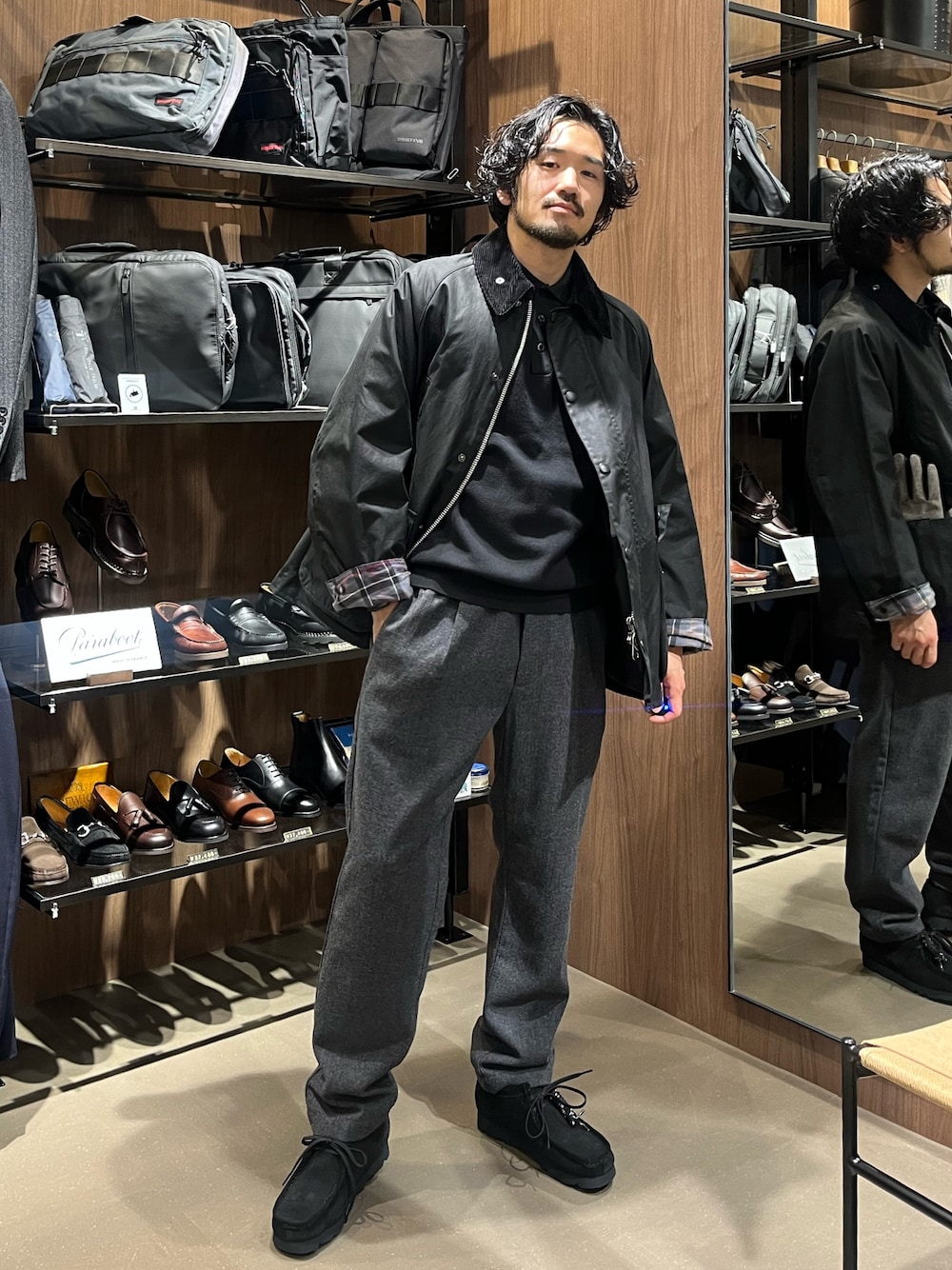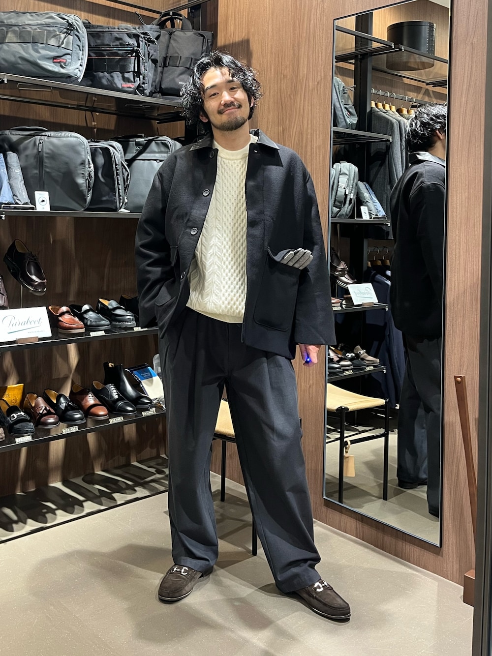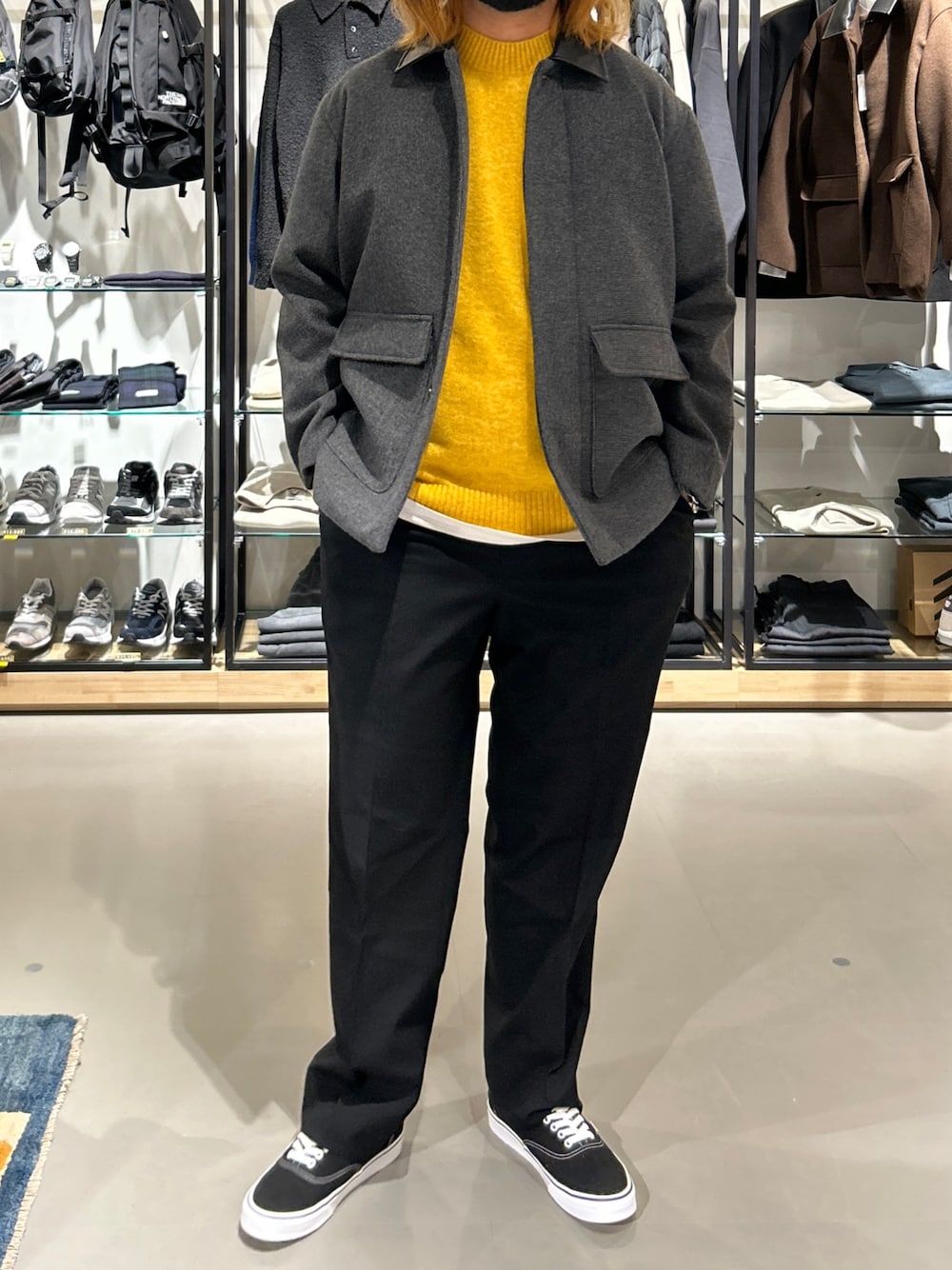 素材の良さと衿の切り替えが程よく全体を引き締めてくれます。ラフになりすぎずモードな印象になるのがポイント。