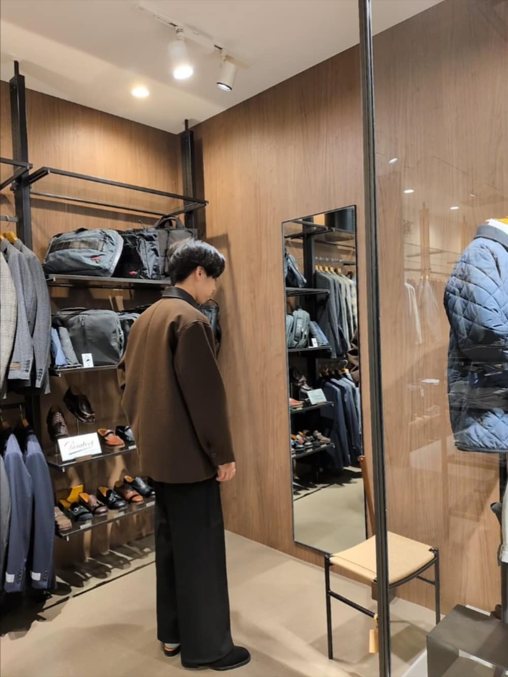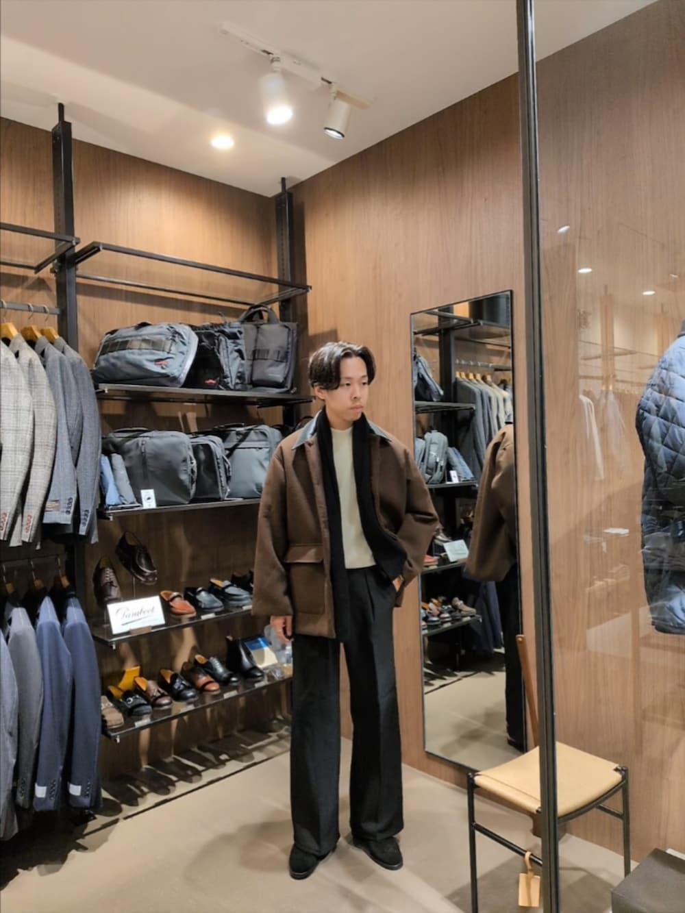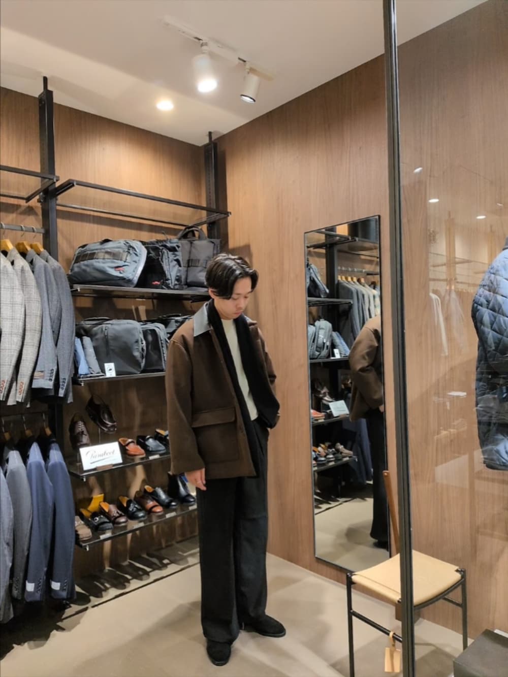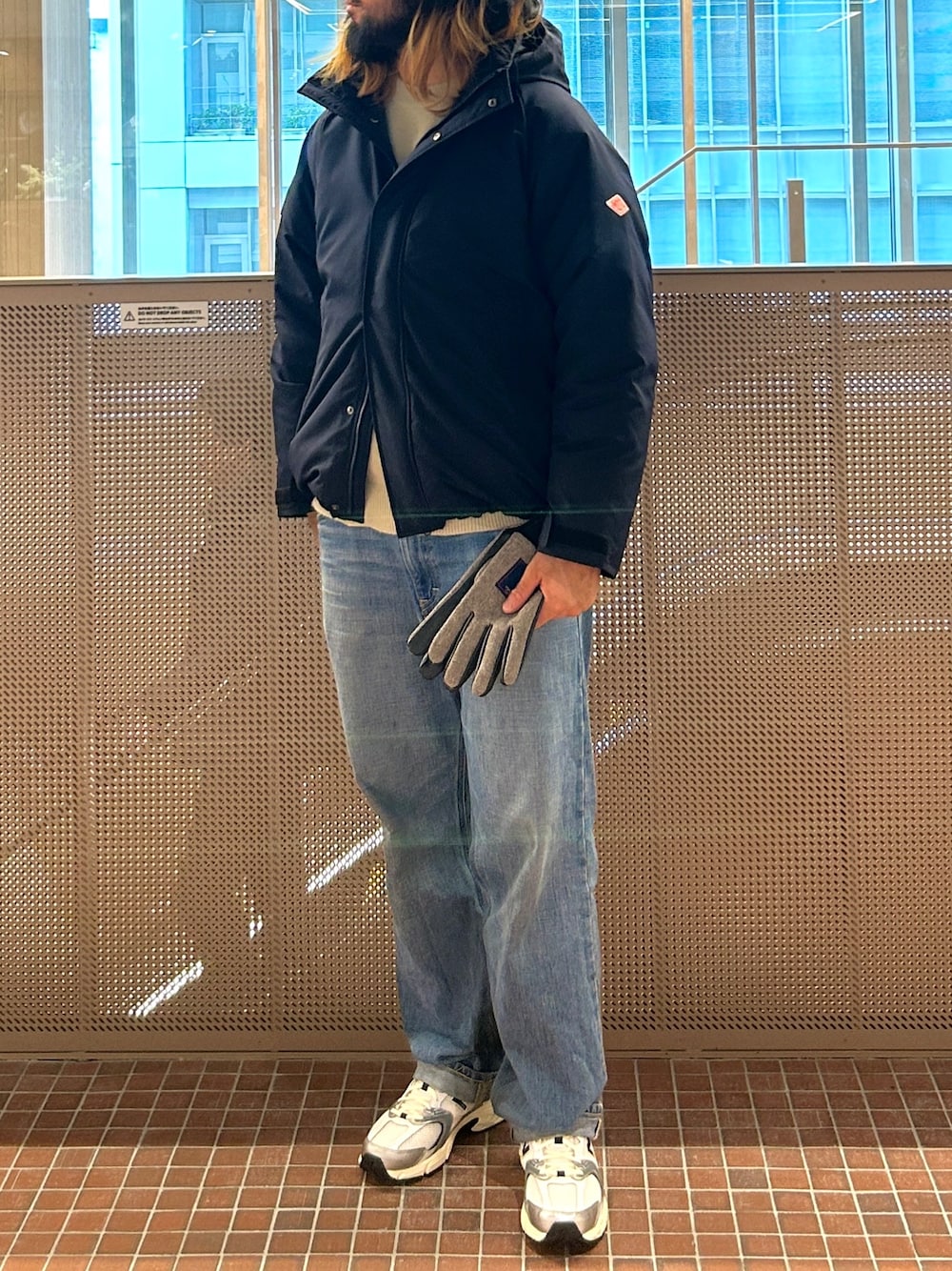 素材の良さと衿の切り替えが程よく全体を引き締めてくれます。ラフになりすぎずモードな印象になるのがポイント。
