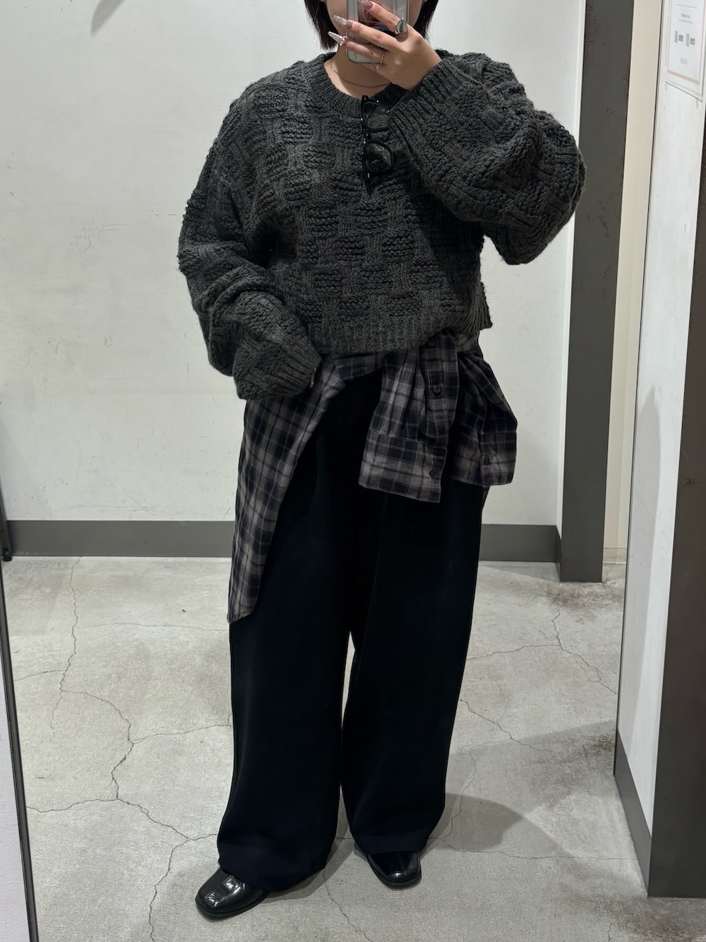 ・ニット×スウェットパンツでラフになりすぎないように、シャツを腰巻きしたり、シューズはキレイめなものを合わせたりラフさ抑えめのコーデに.ᐟ.ᐟ.ᐟ