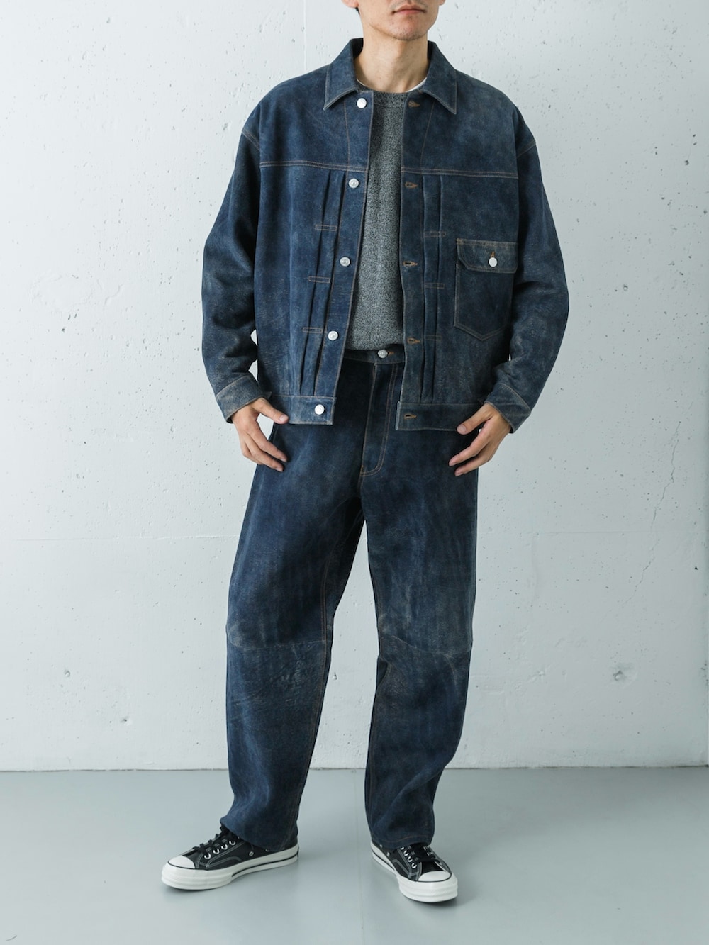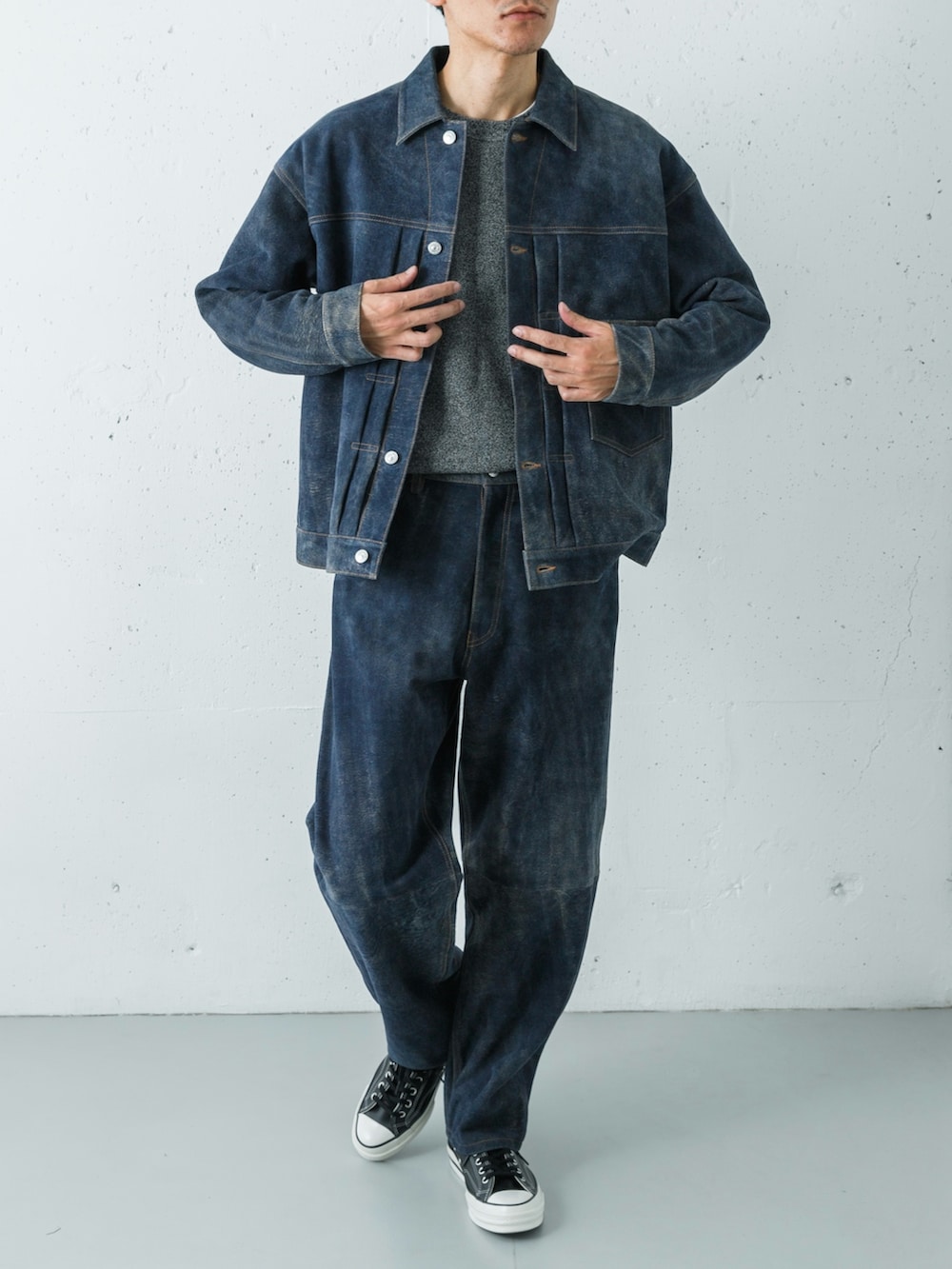 インナーには、crepuscule(クレプスキュール)の代名詞である鹿の子編み(Moss Stitch)のプルオーバーをセレクト。H GRAYの柔らかな表情と凹凸感のある質感が、ネイビーレザーの滑らかな銀面と絶妙なコントラストを生み、首元にクリーンな奥行きをプラスしています。