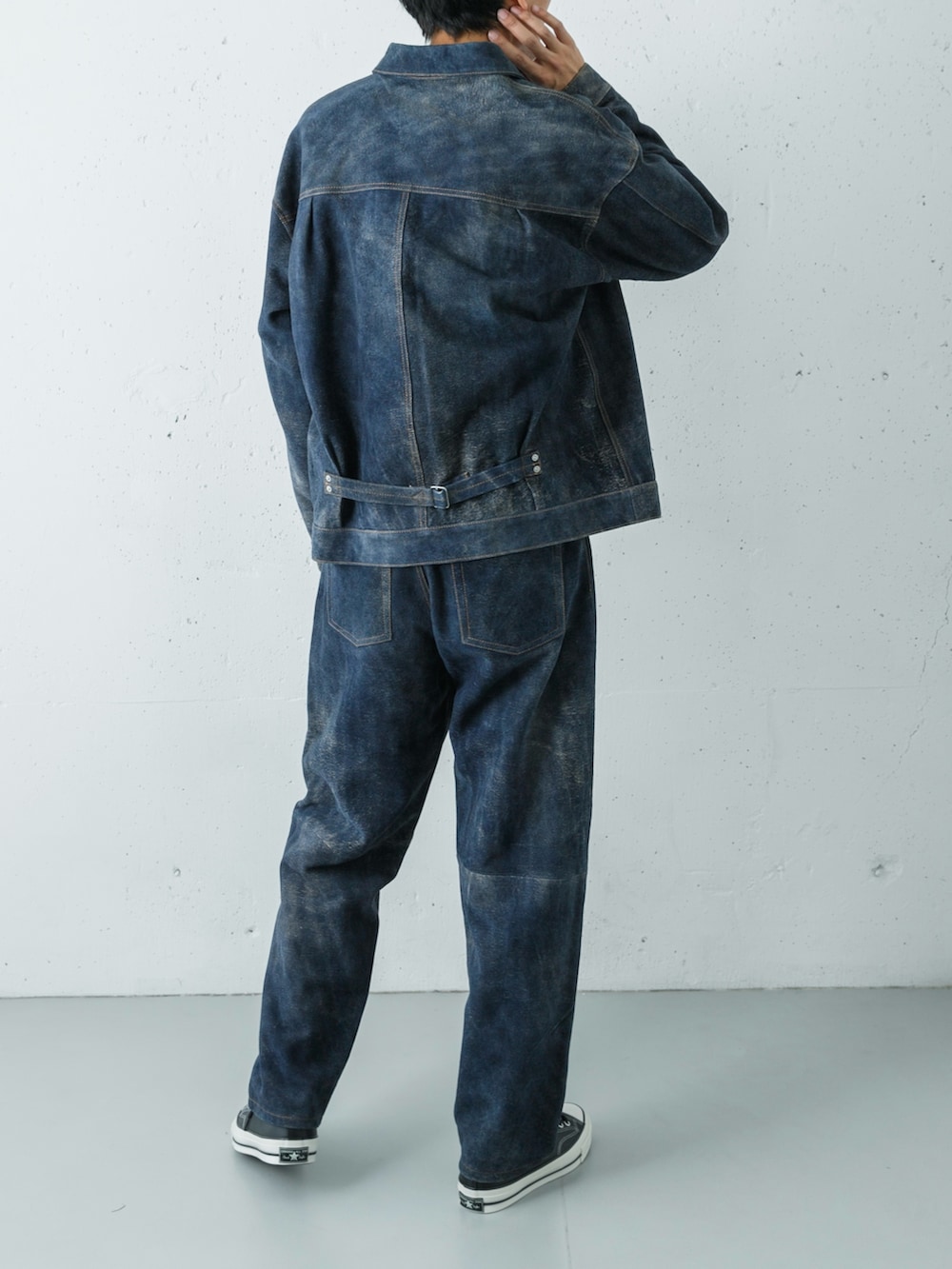 足元は、これまでのスタイルを格上げするALL STAR LGCY LE OXのブラックをチョイス。全身をレザーの質感で繋げつつ、ワイドパンツの裾から覗くボリュームソールが、クラシックなレザースタイルを現代的なストリート・モードへと昇華させています。