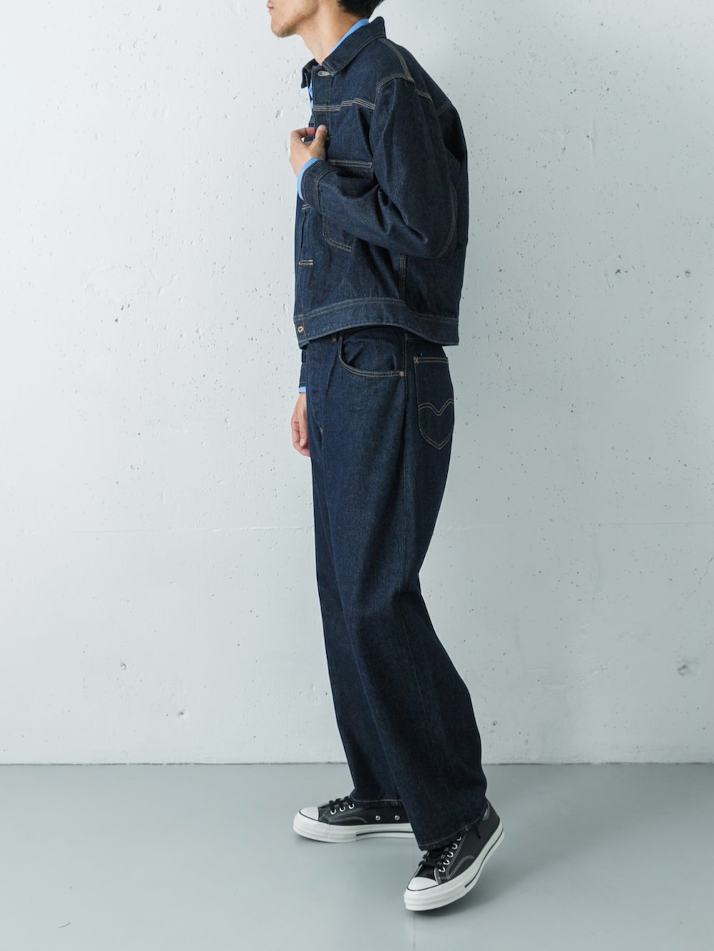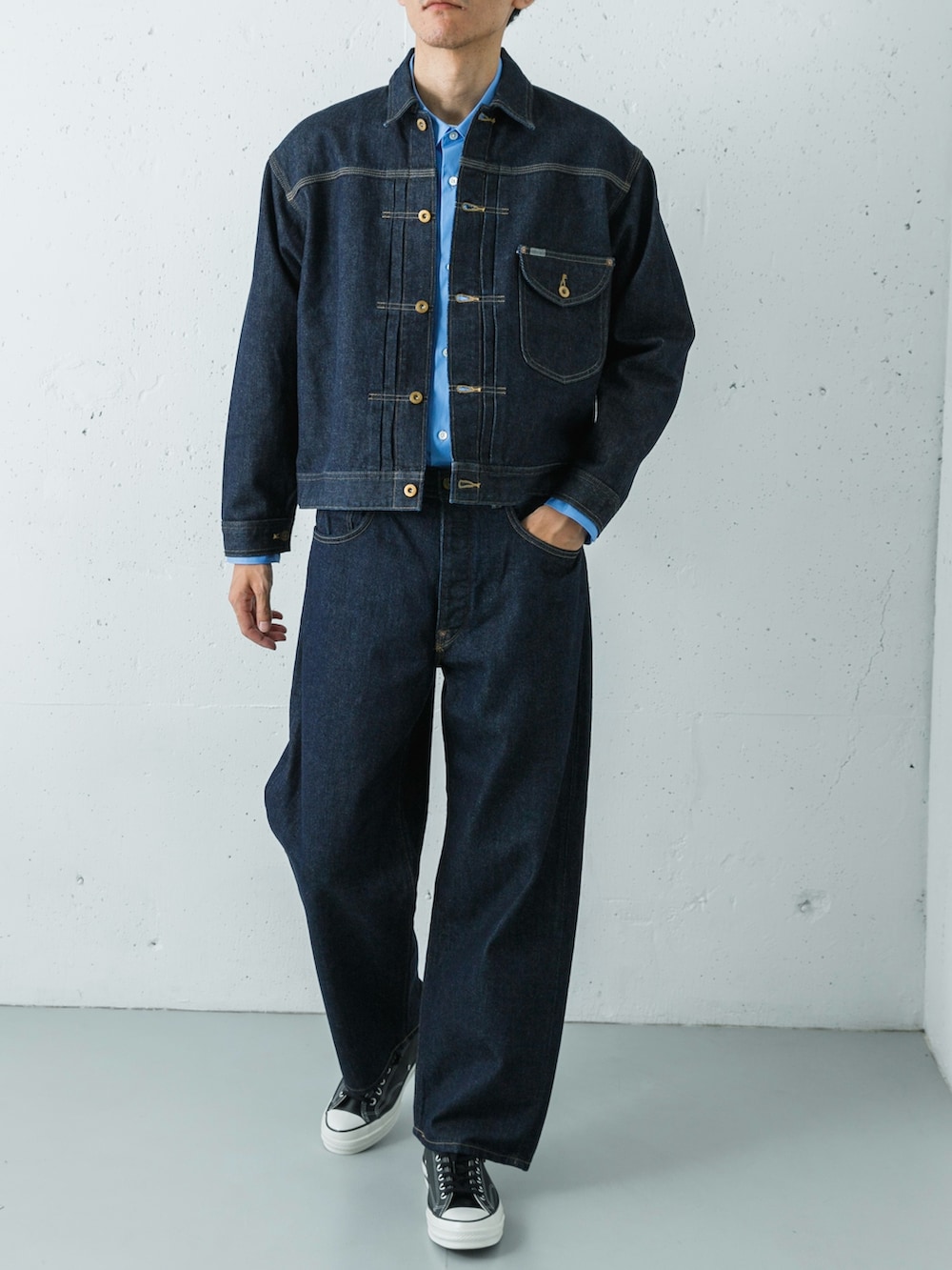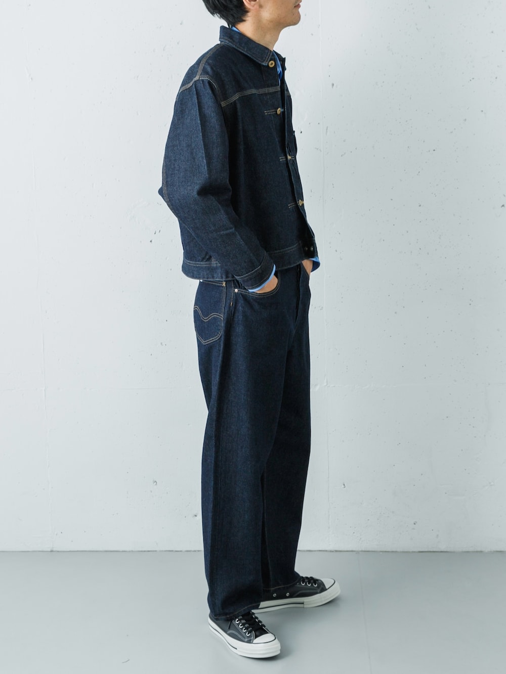 Leeの名作をベースにしたOW(ワンウォッシュ)のカウボーイジャケットと、同素材のカウボーイパンツによるデニムセットアップ。リジットに近い濃紺のデニムが持つストイックな佇まいが、ワークウェアの枠を超えた洗練さを感じさせます。