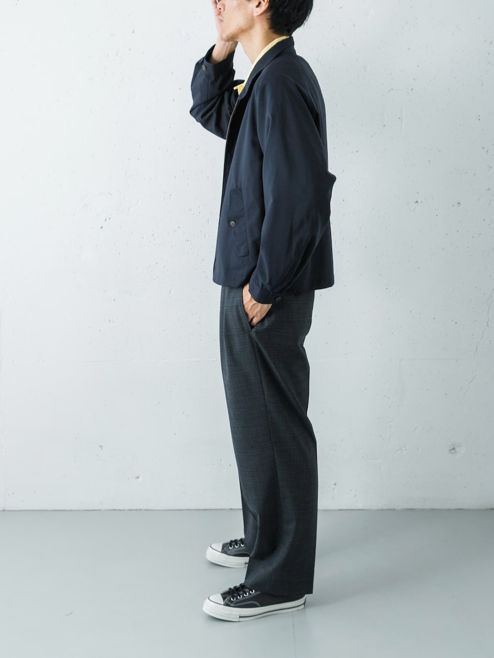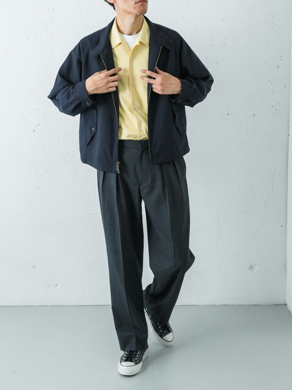 アウターには、Brooks Brothersの伝統的なネイビーブレザーを現代的に解釈したEXCLUSIVE T/W ZIP JACKETを。ボトムスには、クラシックな重厚感を漂わせるチャコールの2インタックトラウザーを合わせ、アイビーの王道をゆく「紺×グレー」の土台を作っています。