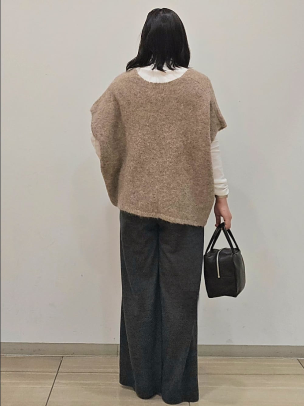 ゆったりとしたベストは、袖がないので上に着るアウターもかさばらず、水仕事やお掃除にも邪魔になりません。
