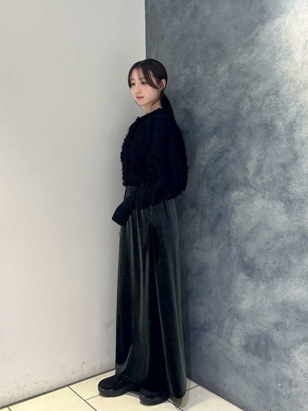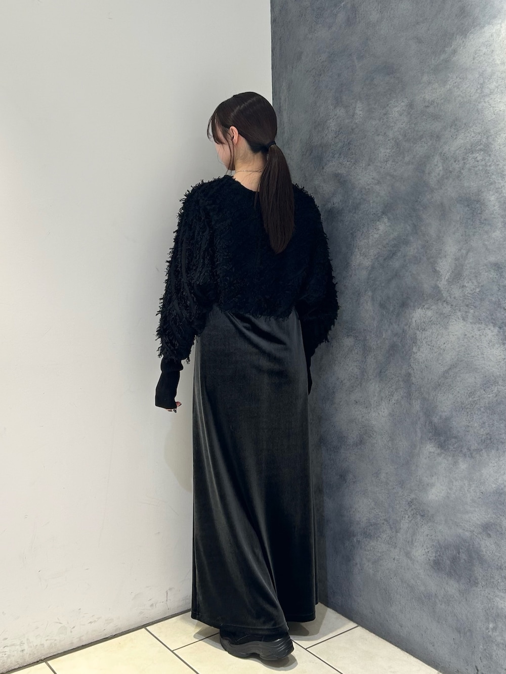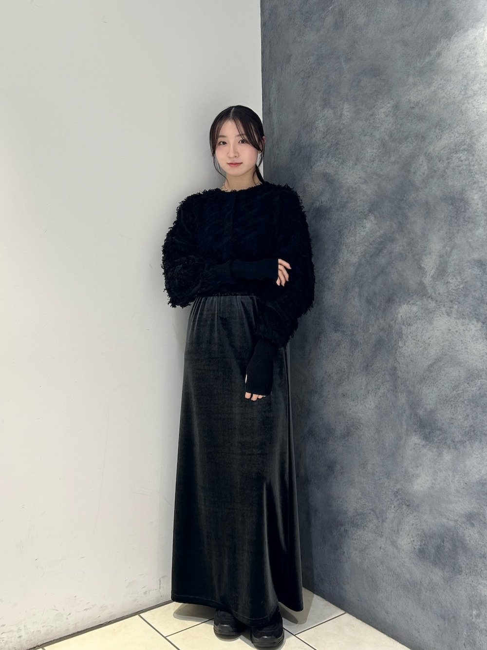 表情のあるフリンジカーディガンを主役に、落ち感のきれいなロングスカートを合わせて縦ラインを強調しました🩶
