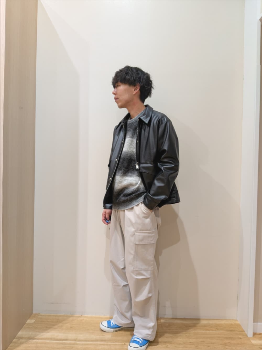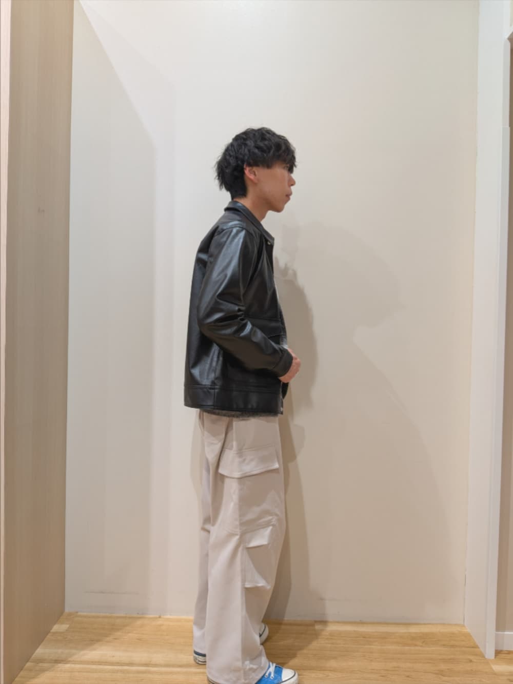 上半身がゴツい感じなので、白のパンツで柔らかい印象になるよう合わせました。