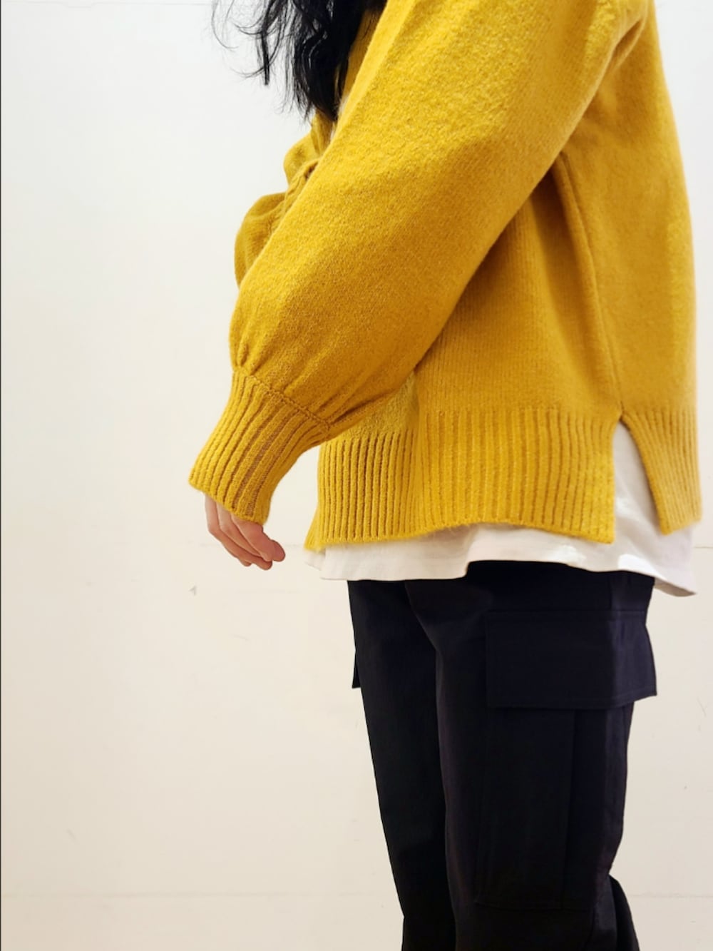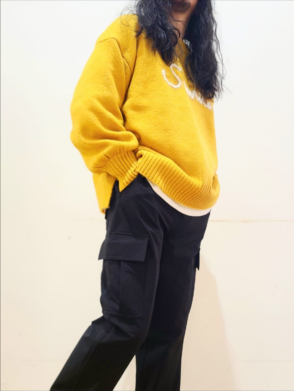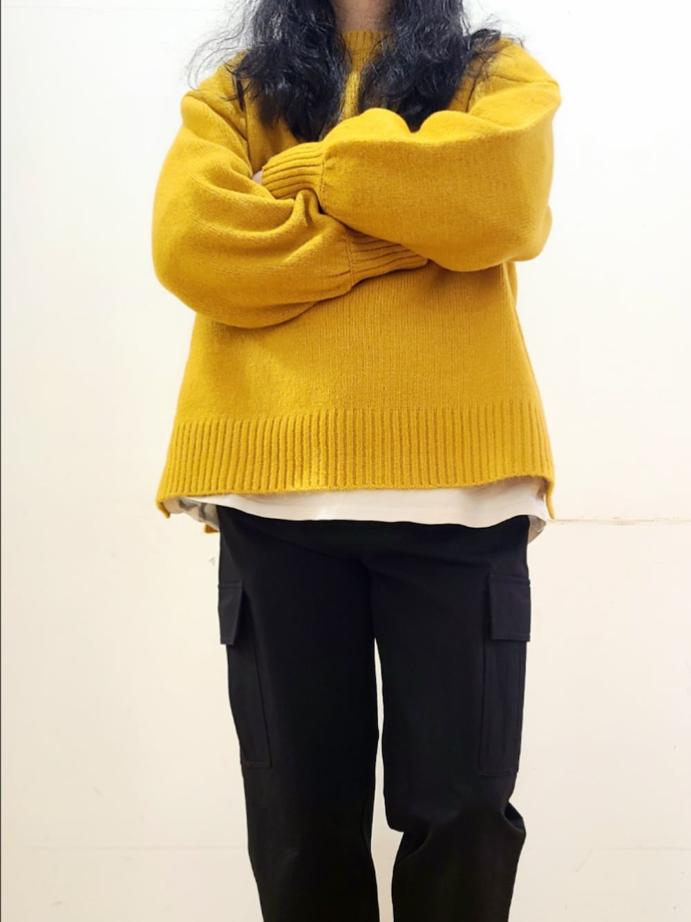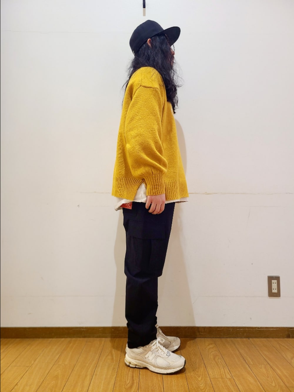 鮮やかなカラーが暗くなりがちな冬のコーディネートにゆったりニット。