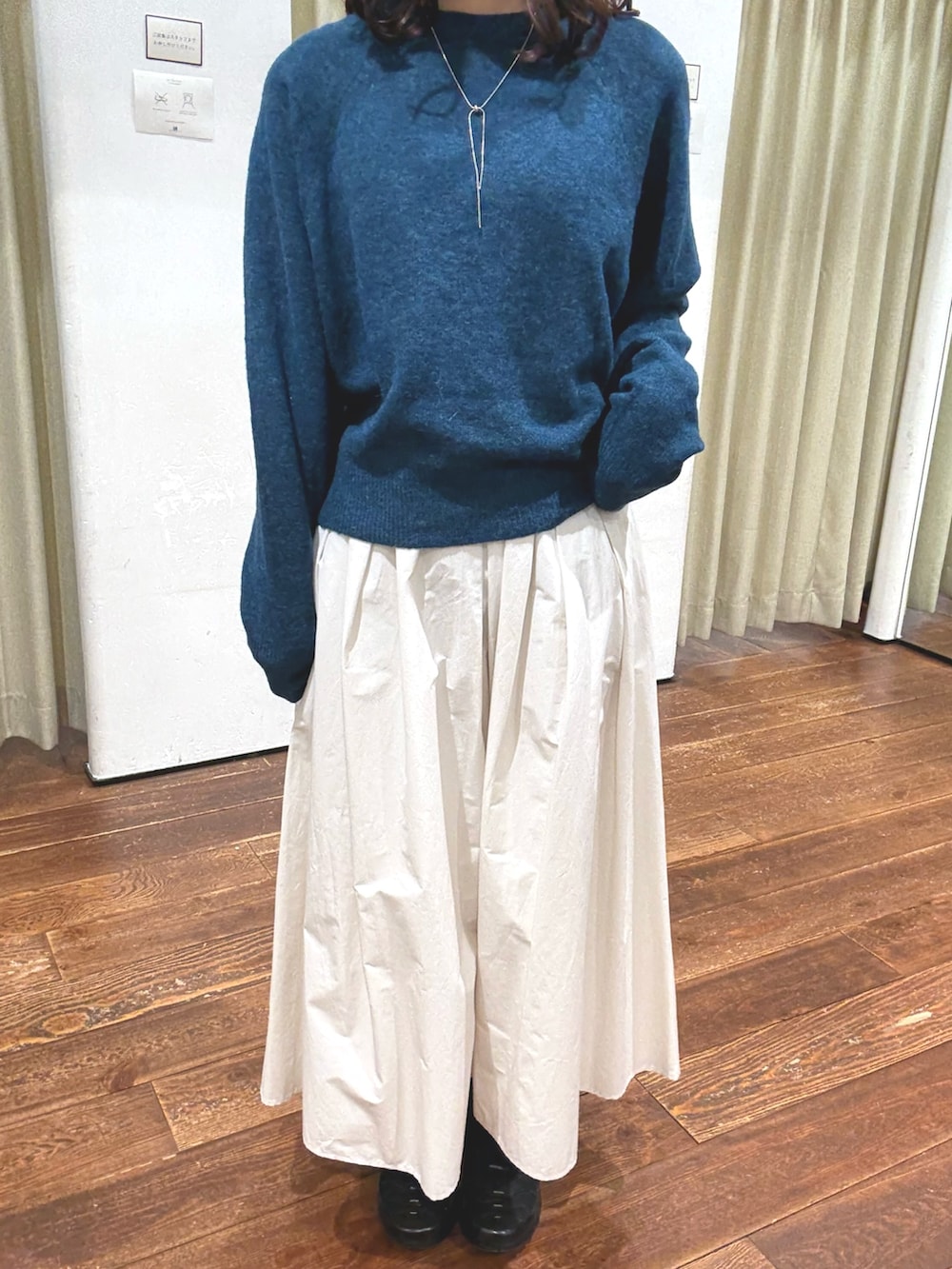 深めのブルーが可愛いニットは、袖が長めでシルエットはスッキリ着ていただけます。