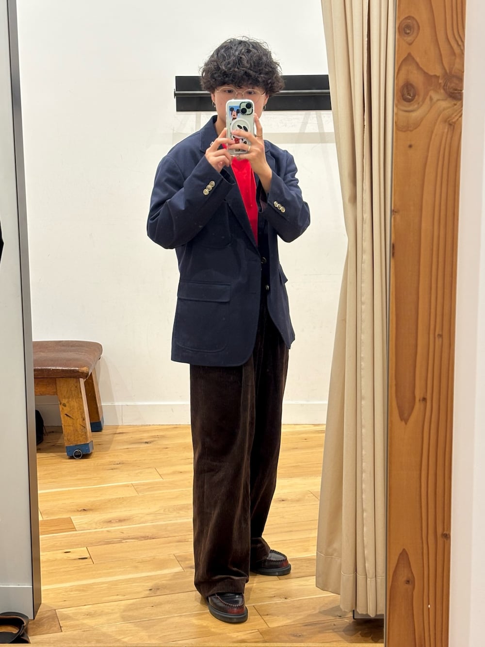 ジャケットとブラウンのコーデュロイパンツを合わせることで季節感を出しながら綺麗めにまとめました。