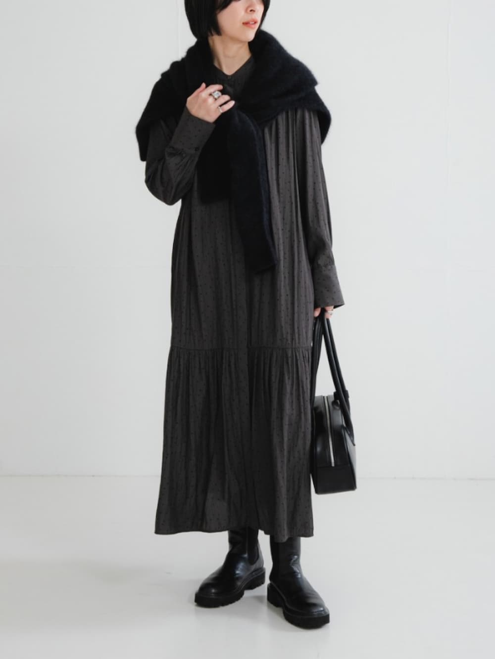 裾に向かってふんわりと広がるティアードシルエットが華やかさを演出します。一枚でさらりと着るだけで様になるデザインで、パンプスやブーツを合わせるとシックな着こなしに。パンツをレイヤードして着たりカジュアルダウンするのもおすすめです。